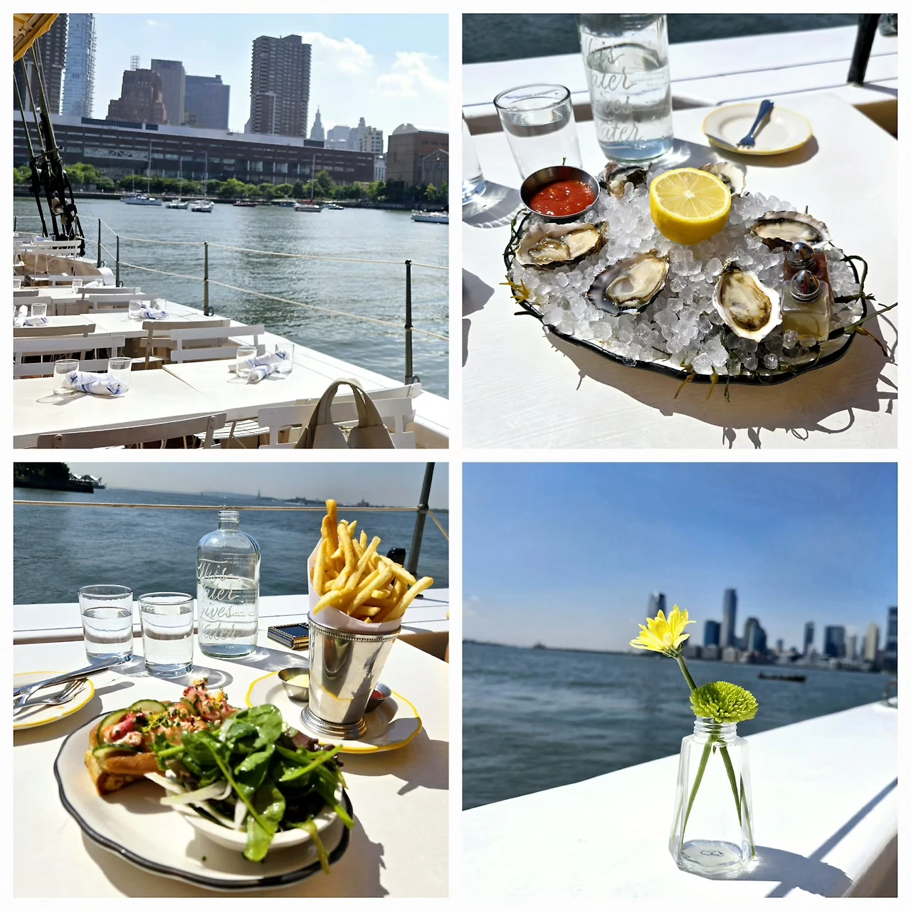 마침내 딸이 초대한 레스토랑에 도착했는데요. 점심시간 전이어선지 사람은 그다지 많지 않았어요. 웨이트리스가 "너를 위한 꽃"이라며 주는 꽃을 받고, 아름다운 허드슨강과 맨해튼이 한눈에 보이는 곳에 자리를 잡았는데요. 멀리 있는 경치가 한눈에 쏙 들어와 손을 펼치면 잡힐 것만 같았습니다. 뷰가 좋으니 맛은 별로겠지! 란 선입견을 깨고, 랍스터 샌드위치와 흔하디흔한 감자튀김도 특별히 맛있어서 싹싹 비웠습니다.