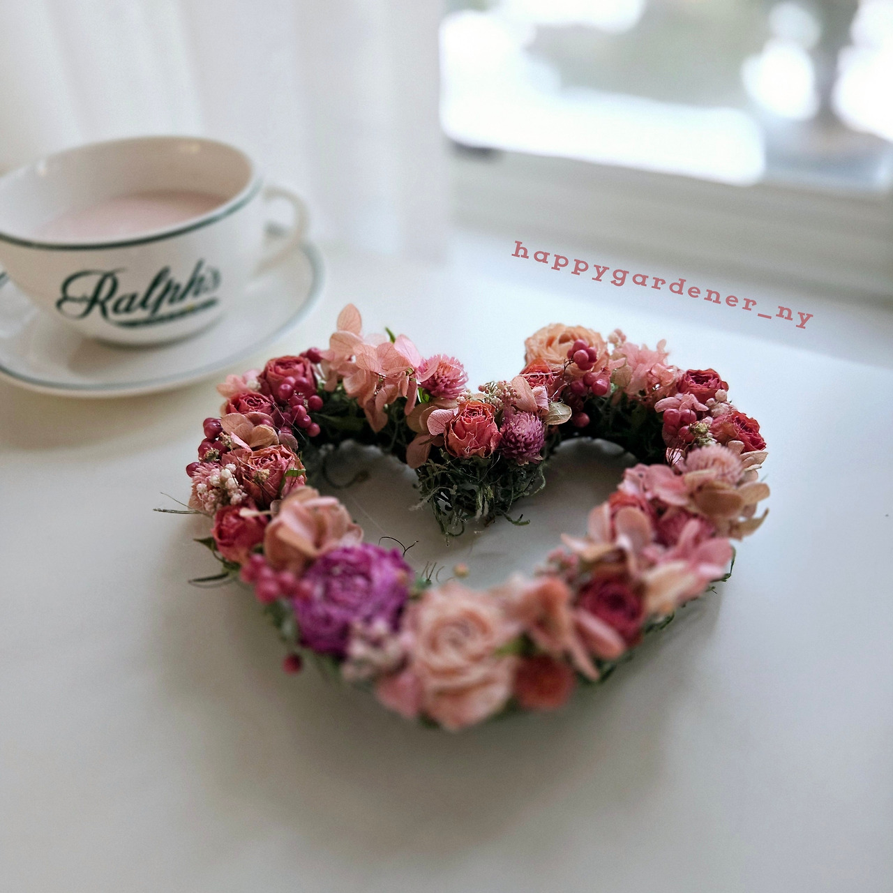 곧, 밸런타인 데이여서 말린 장미와 수국으로 하트 리스를 만들었습니다.