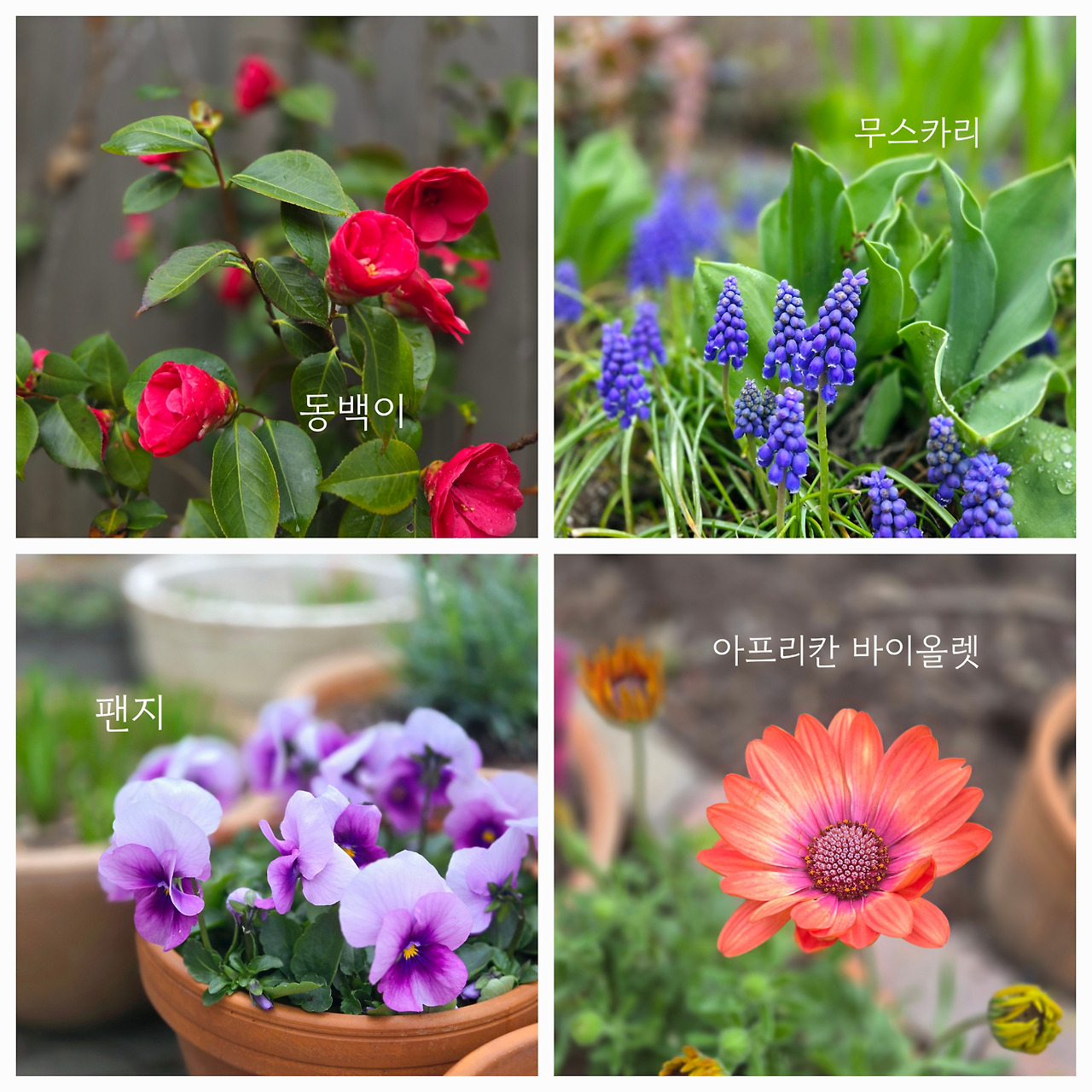 느긋한 일요일 오후. 정원일 하기 딱 좋은 날이다. 며칠 동안 잔잔한 봄비가 내려 꽃잎을 촉촉이 적시더니 그사이에 꽃들이 화사하게 피어났다. 빗물 보약이라도 먹은 걸까? 작년엔 꽃봉오리만 맺히고 피지 않던 동백도, 서운했던 나의 마음을 눈치챘는지 올해는 풍성한 꽃을 선물해 준다. 보라 무스까리도 바이올렛도 귀여운 얼굴을 보여주고.