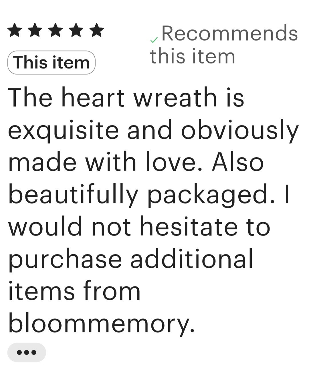 그리고 며칠 뒤, 예쁜 별 다섯 개와 함께 이런 리뷰가 달렸다. “The heart wreath is exquisite and obviously made with love. Also beautifully packaged.” 하트 리스가 너무 섬세하고, 사랑을 담아 만든 게 느껴졌다는 말. 포장도 아주 예뻤다고.