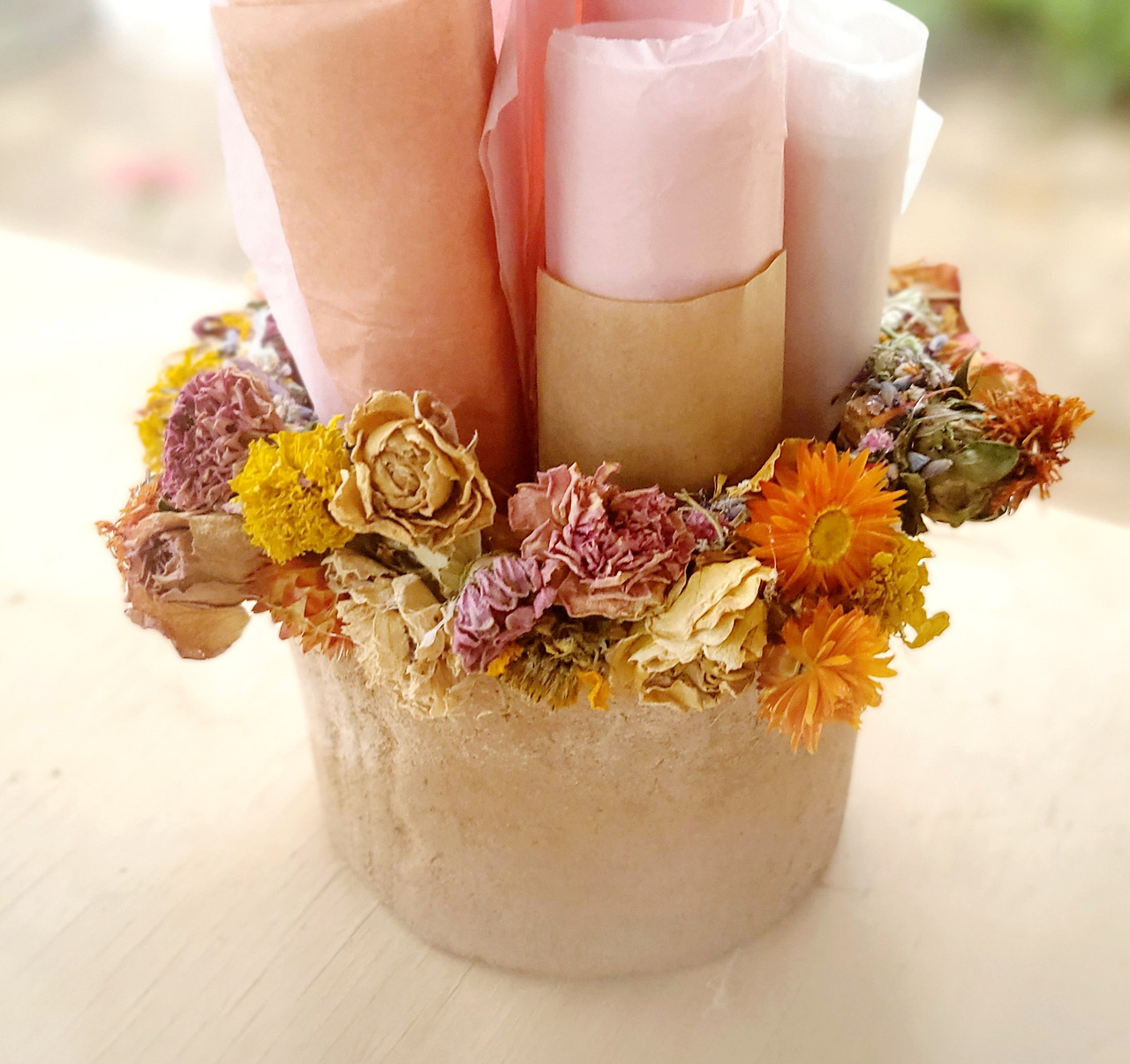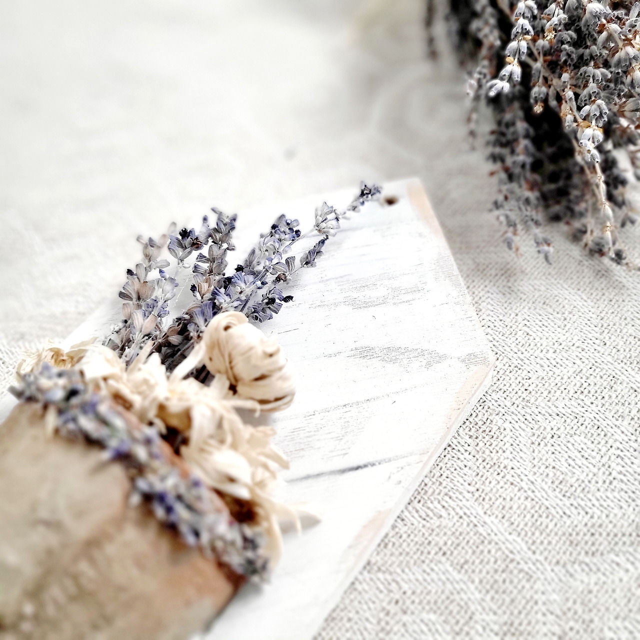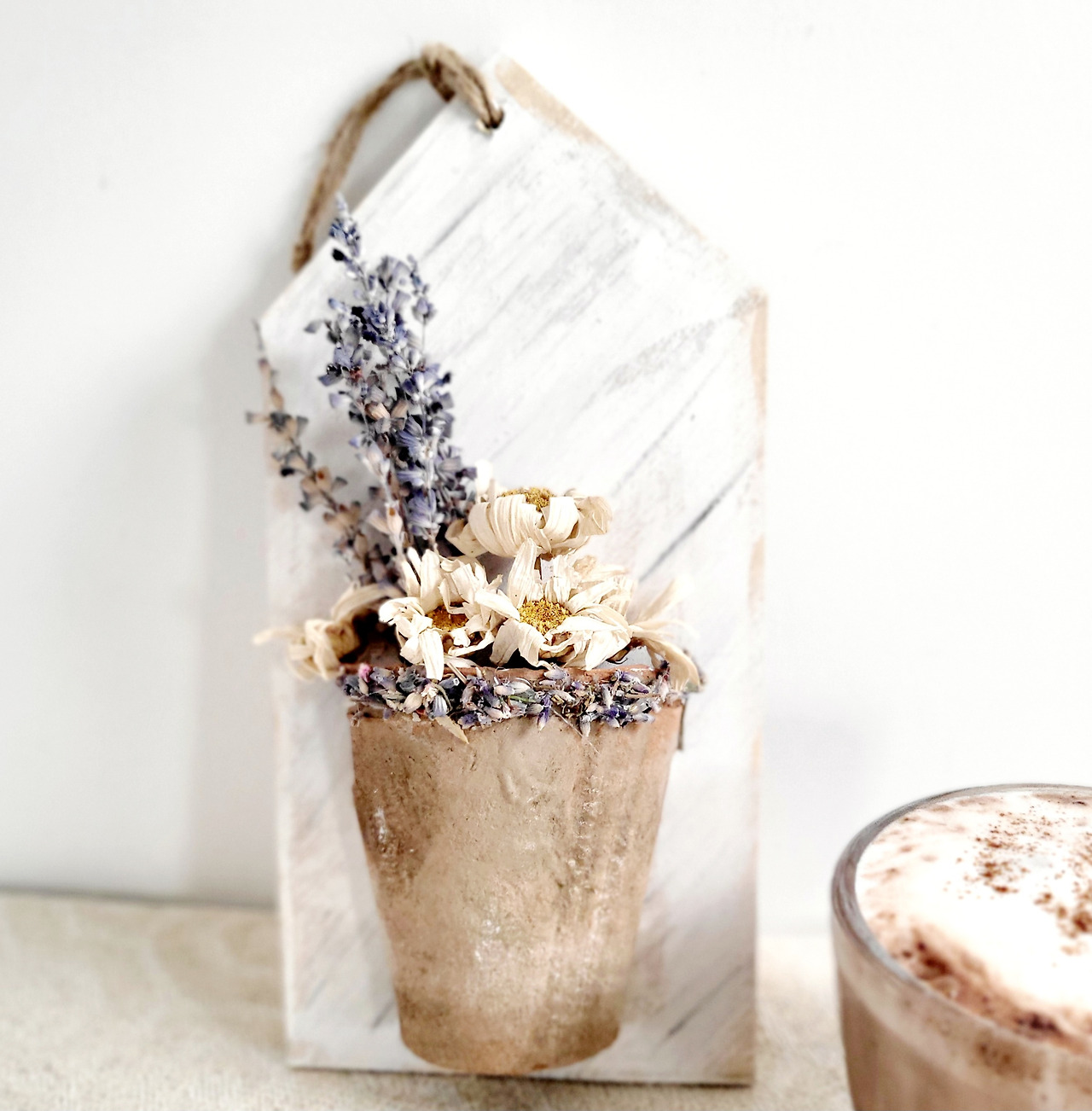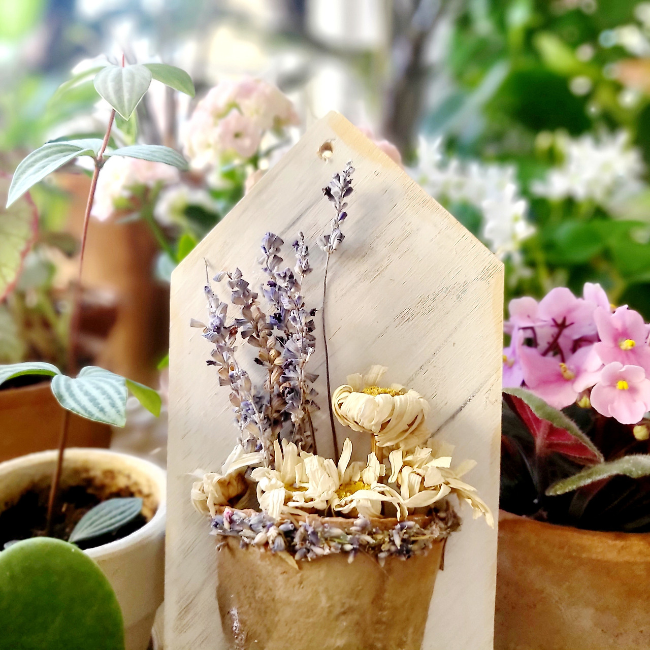 하얀색 페인트가 칠해진 나무판에 깨진 화분을 글루건으로 고정해 주고 벽에 달기 위해 구멍을 뚫어주었다. 깨진 화분이라 자칫 삭막해 보일 수가 있어서 테두리는 라벤더꽃 가루를 삥 둘러 따뜻한 느낌이 나도록 표현해 주었다. 간단하면서도 분위기 있는 벽걸이가 마음에 들어 뿌듯한 기분이 들었다. 완성된 벽걸이 화분 걸이에 말린 데이지와 라벤더를 넣어 주었는데 화분이 빈티지 느낌이 나서인지 마른 꽃이 이주 잘 어울렸다.