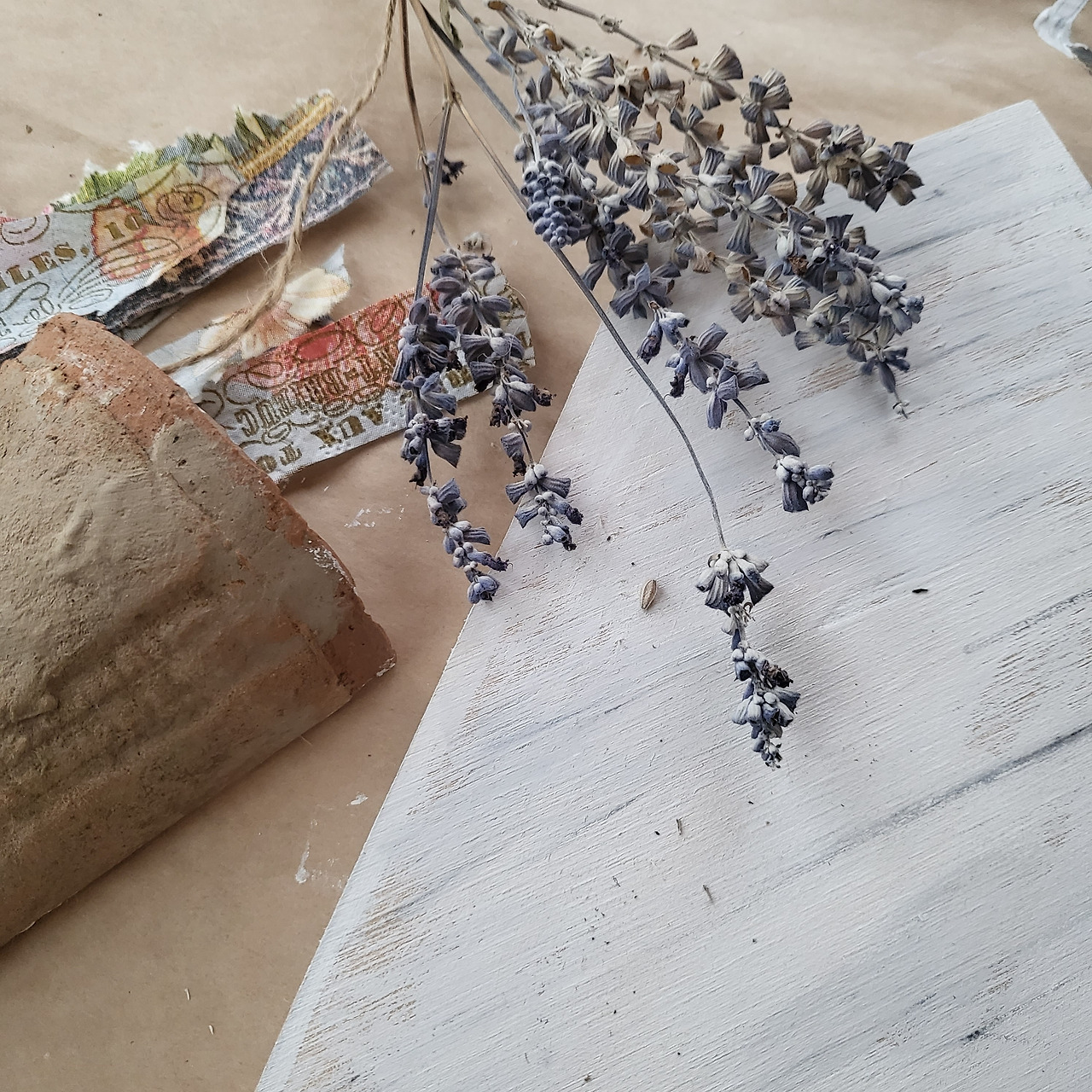일단 디자인이 정해졌으니 재단한 나무에 깨진 화분을 놓고 여러 구상을 해봤다. 라벤더도 가져와 보고 분위기 있는 티슈페이퍼도 붙여봤다. 일단은 마른 꽃을 넣을 화병을 만들기로 하고 재단해놓은 나무에 하얀색 아크릴 페인트를 칠해 주었다. 군데군데 빈티지 느낌이 나도록 페이퍼로 닦아주었다.