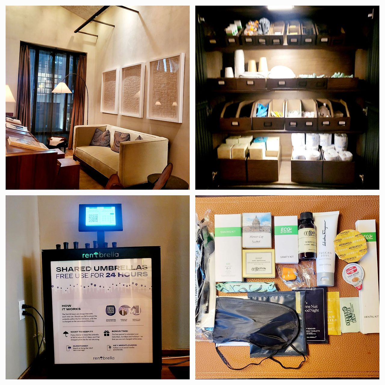 2층에는 휴식 공간과 여러 종류의 책이 있어서 언제든지 와서 책도 보고 편한 소파에서 쉴 수 있다. 특히 좋았던 점은 우리가 머무를 동안 필요한 모든 소모품을 공짜로 쓸 수 있다는 점이다. 샴푸, 린스, 바디위시는 물론이고 핸드로션, 치약, 칫솔, 비누, 커피, 티, 헤어켑, 면도용품, 일회용컵까지 질좋은 제품들로 준비 되어 있었다. 화장지와 티슈 박스까지 있어서 편리하게 사용했다. 그뿐만 아니라 비가 오면 우산을 공짜로 빌려주는 기계까지 있다.