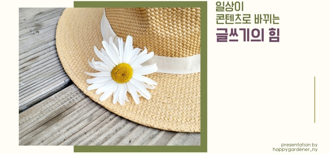 긍정적인 마음으로 바뀌자 15분 동안 읽을 원고가 금세 정리되었다. 주제는 "일상을 콘텐츠로 바꾸는 글쓰기의 힘"으로 하고 나의 일상을 콘텐츠로 만들어 가는 글쓰기에 관한 이야기를 나눠보기로 했다. 슬라이드 8개는 그동안 정리해 놓은 사진들이 많아 쉽게 만들 수 있었다.