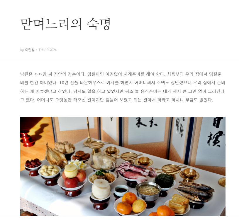 며칠 전 명절에도 그랬다. 명절음식준비와 청소를 마치고 나니 새벽 5시가 다되었다. 그냥 잠깐이라도 눈을 붙일까 하다가 잠들면 못 일어날 것 같아서 밤을 새워야겠다는 생각에 브런치를 열었다. '맏며느리의 숙명'이라는 주제로 주저리주저리 하소연을 했다.