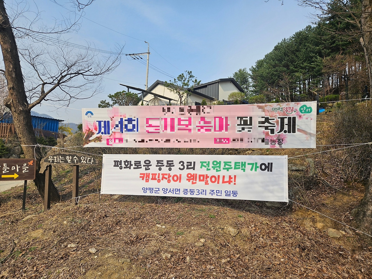 지나다보니 마을 입구에도 떡하니 걸어놨다... 현수막도 마치 온마을 사람들이 반대하는 것처럼 'ㅇㅇ3리 일동'으로 만들어 붙였다. 어이가 없었다. 우리는 이 상황이 이해가 안 되었다. 우리가 매입한 토지는 엄연하게 영업시설이 들어와도 되는 계획관리 토지이고 주민들의 피해를 최소화할 수 있는 거리로 말 그대로 산 꼭대기이다. 그리고 엄청나게 큰 캠핑장 시설도 아닌, 자연친화적이고 사이트 6개인 소규모 힐링 쉼터인데... 어떤 개발이 민폐라고 우기는 건지... 조금 황당한 상황이었다. 어느 정도 예상되는 피해는 최소화하고 그에 따른 대책도 마련 중이었다.