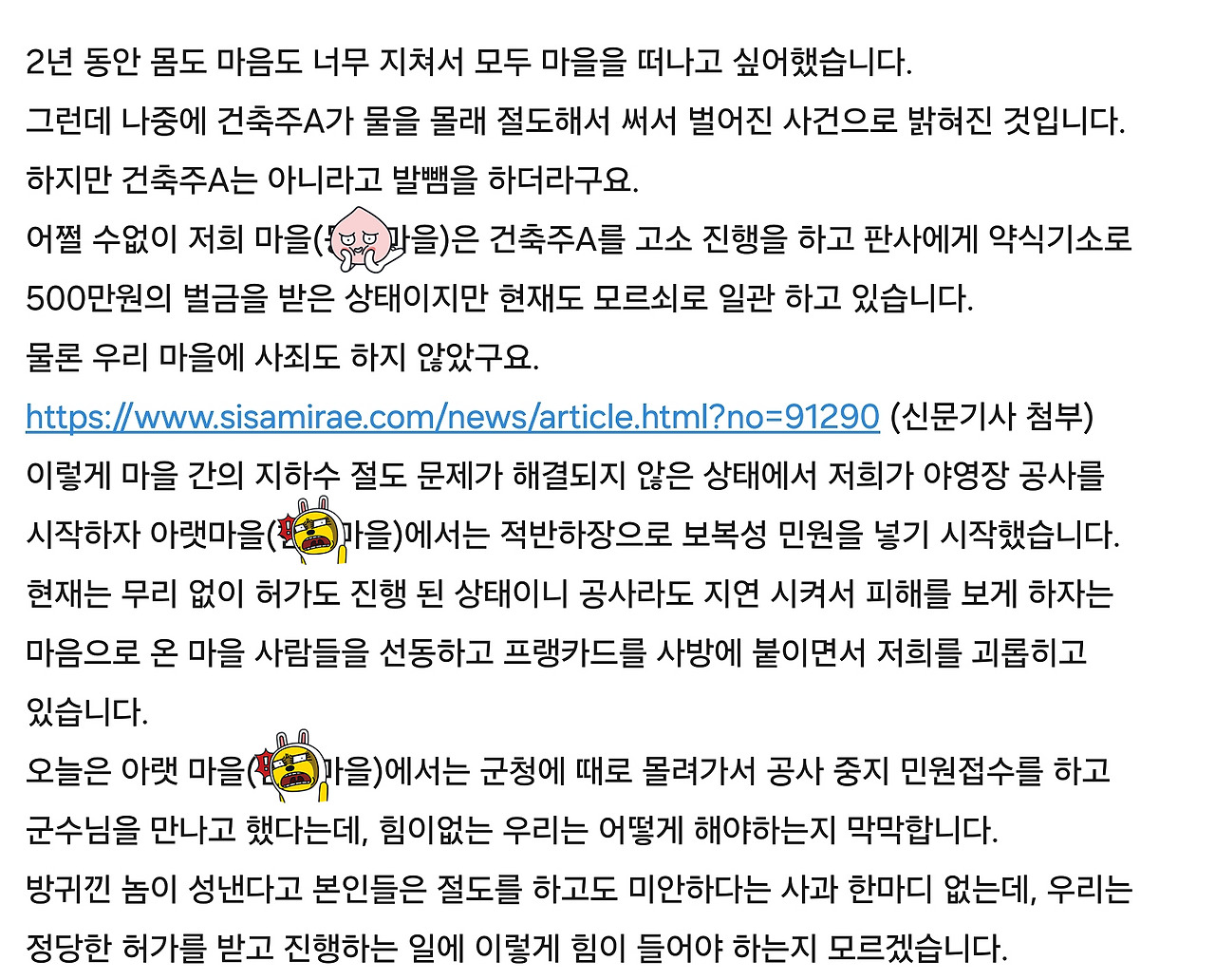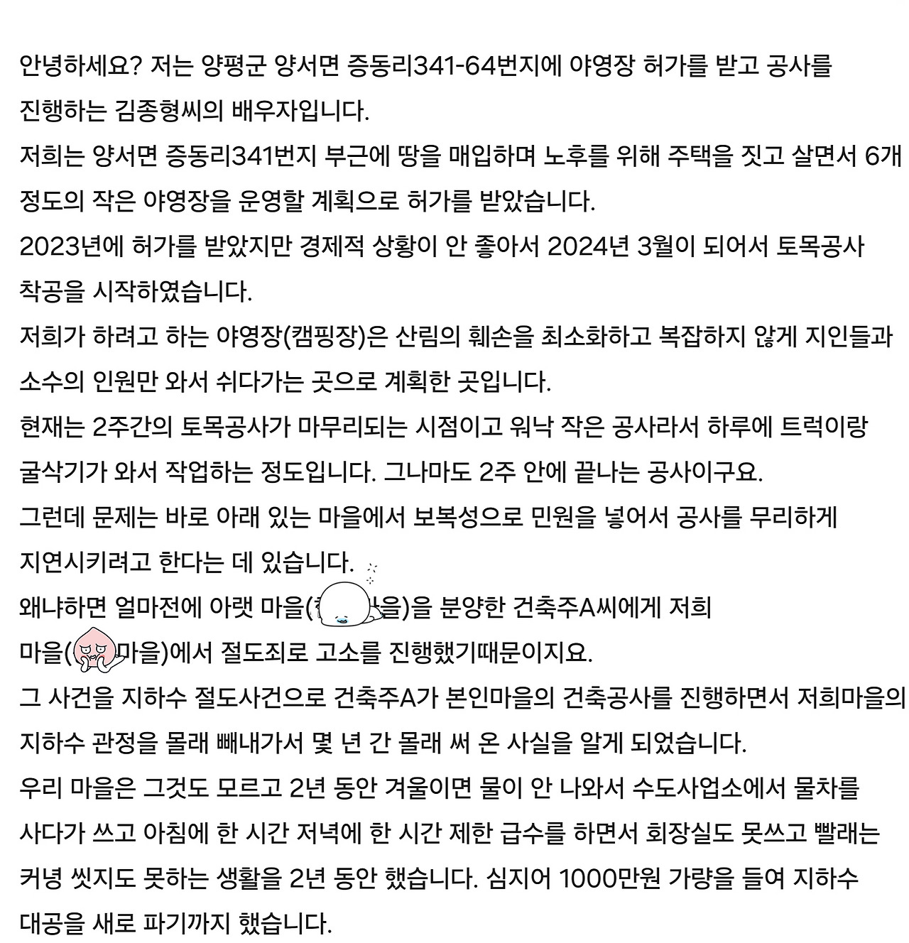 사실 아랫마을 사람들이 캠핑장시설을 반대한다고 해서 대통령실에 무작정 민원을 신청한 건 아니었다. 그 사람들이 현수막까지 걸어가면서 마을 전체를 들쑤시는 검은 속내가 있기 때문에 억울해서 가만히 있을 수는 없었다. [대통령실 국민제안 민원내용 첨부]