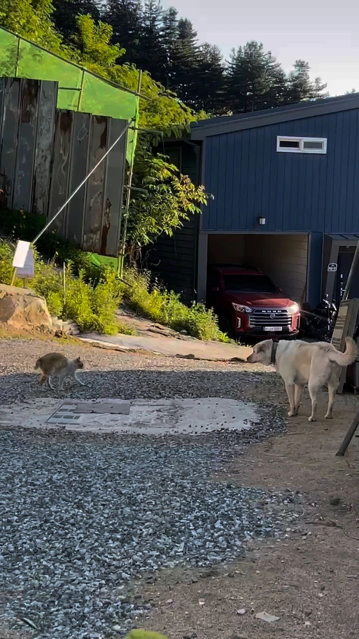 퇴근 후 마당에 있던 보리가 갑자기 대문 밖으로 뛰쳐나갔다! 남편은 무슨 일 인가 해서 그쪽을 봤더니, 길고양이 한 마리가 서있었다. 우리 마당에 너무도 당당히!