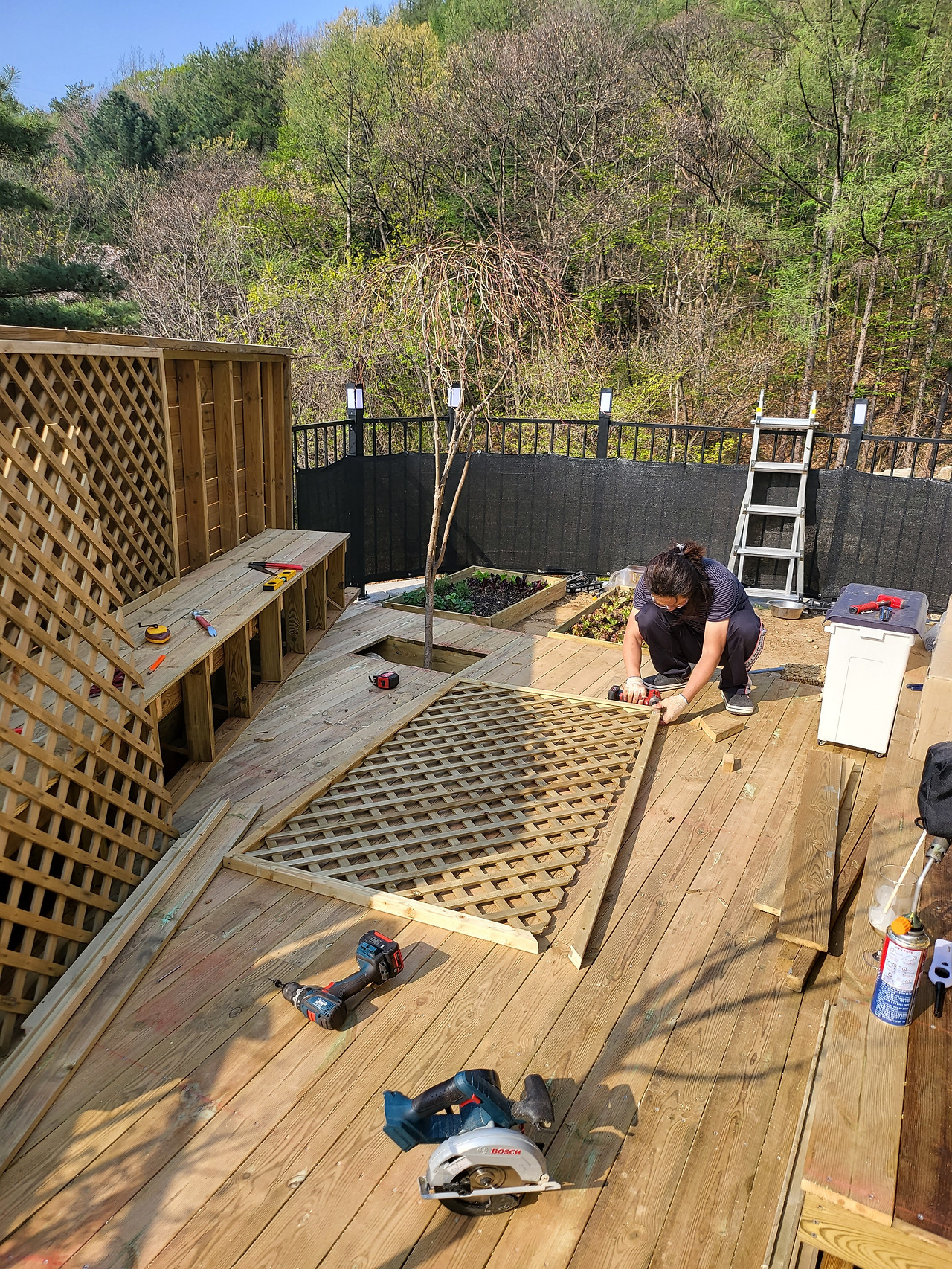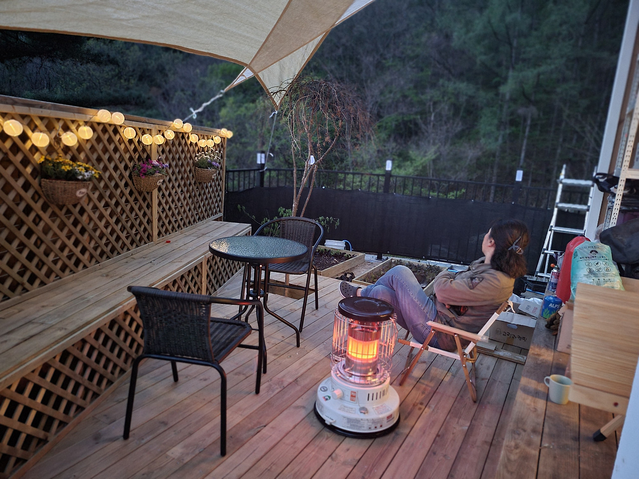 하지만 우리의 시야를 가로막았던 4미터의 벽이 애물단지였지만 남편의 금손 덕분에 너무 예쁜 공간으로 바뀌었다^^ 남편이 바닥에 나무를 깔고 벤치를 만들어 집 앞을 카페로 변신시켜 주었습니다. '팬더님의 셀프공사'로 다시돌아올 예정이다.