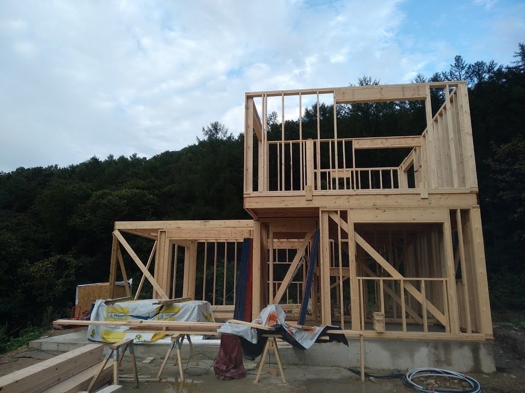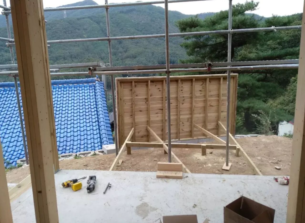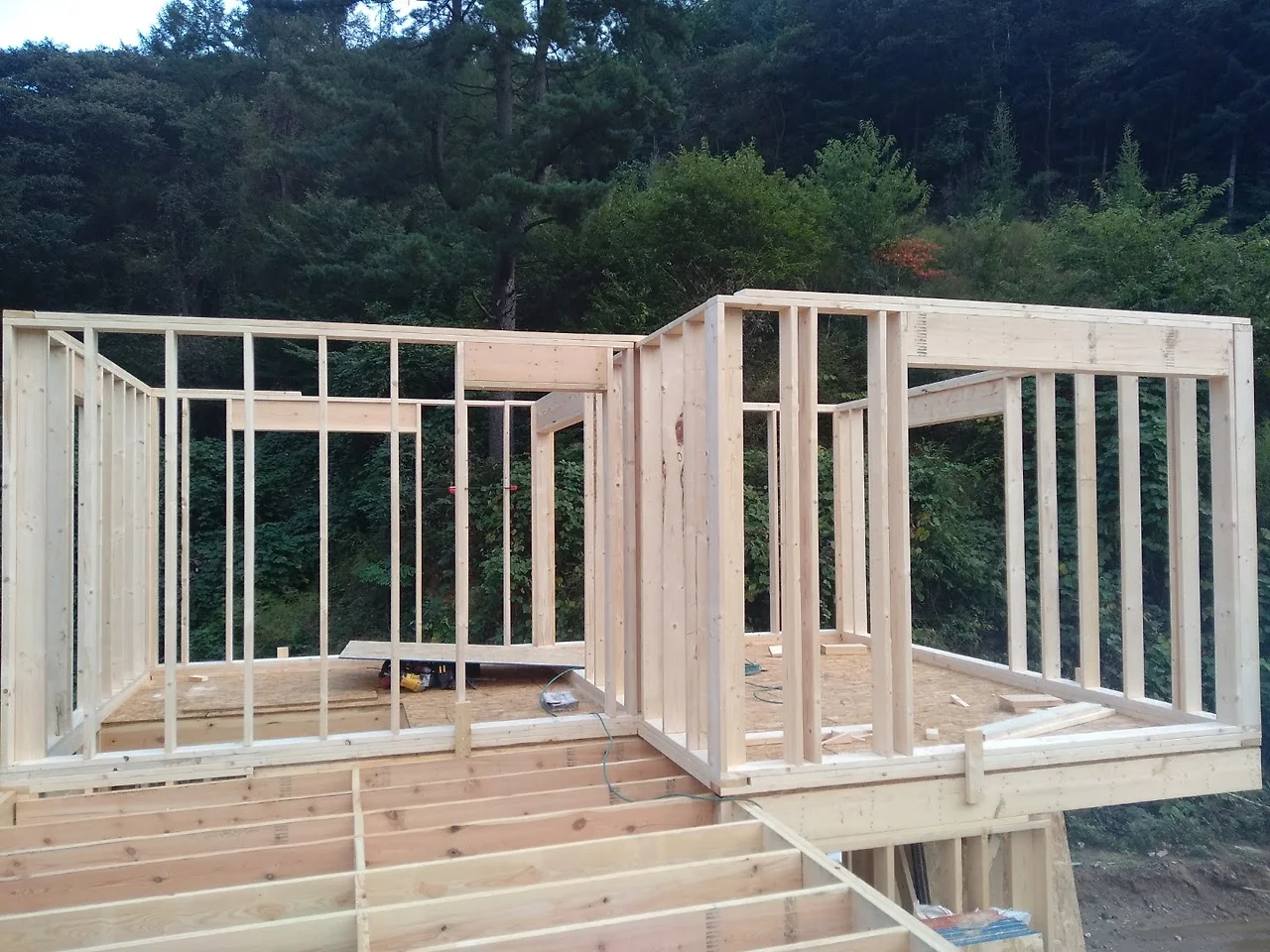 2층은 계단 옆에 작은 공간과 방하나를 만들고 나머지는 테라스를 만들 계획이다. 그래서 1층보다 훨씬 일정이 빨리 끝났다. 2층방에 크게 뚫린 부분이 창문인데 크게 만들 긴 했지만 지금 와서 생각해 보니 2층 뷰가 너무 좋아서 'ㄱ자 창문'으로 만들걸 그랬다는 아쉬운 생각이 들었다. 하긴, 밖을 더 잘 보려면 테라스로 나면되지뭐...목수님들 실력이 너무 좋아서 몇 시간이 지나니 벽이과 천장이 만들어졌다. 옆에서 보고 있으면 구경하느라 시간 가는 줄 몰랐다.