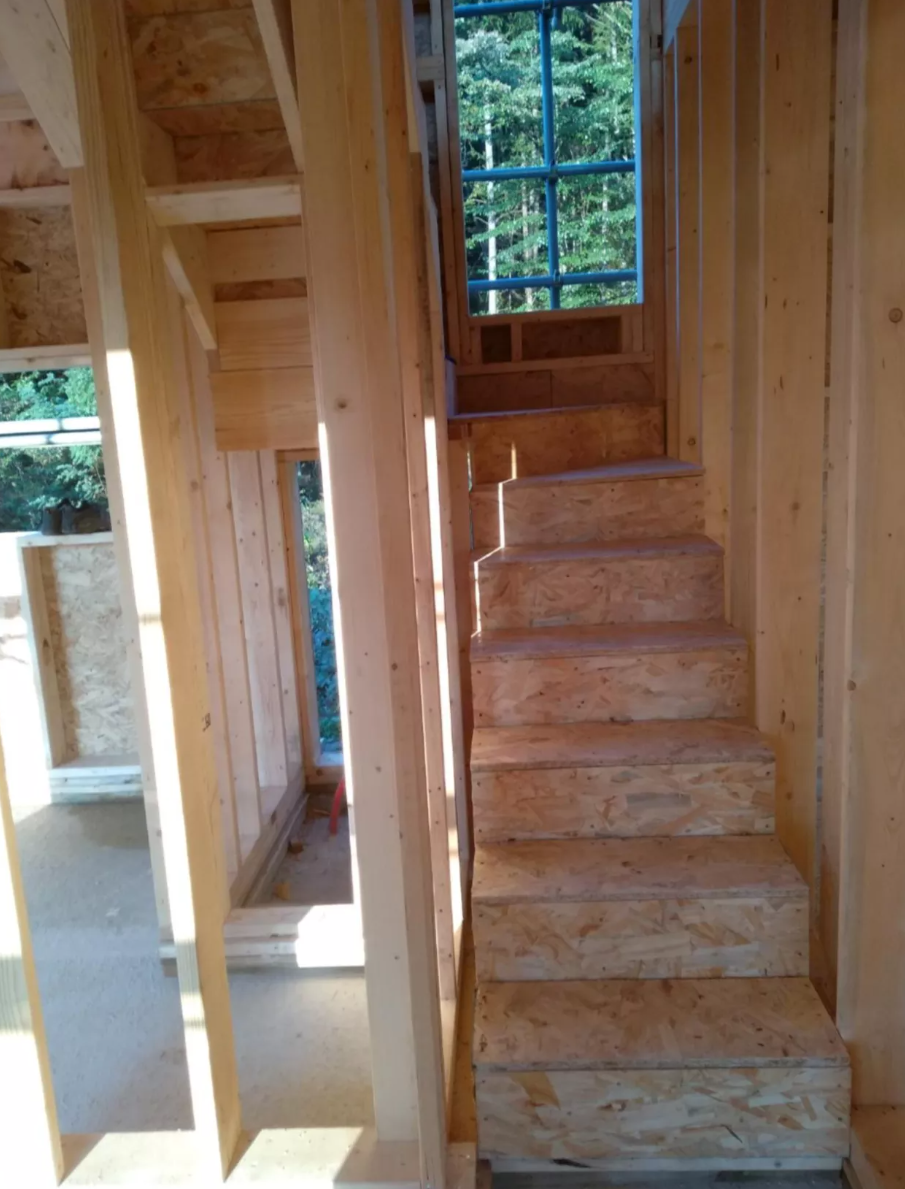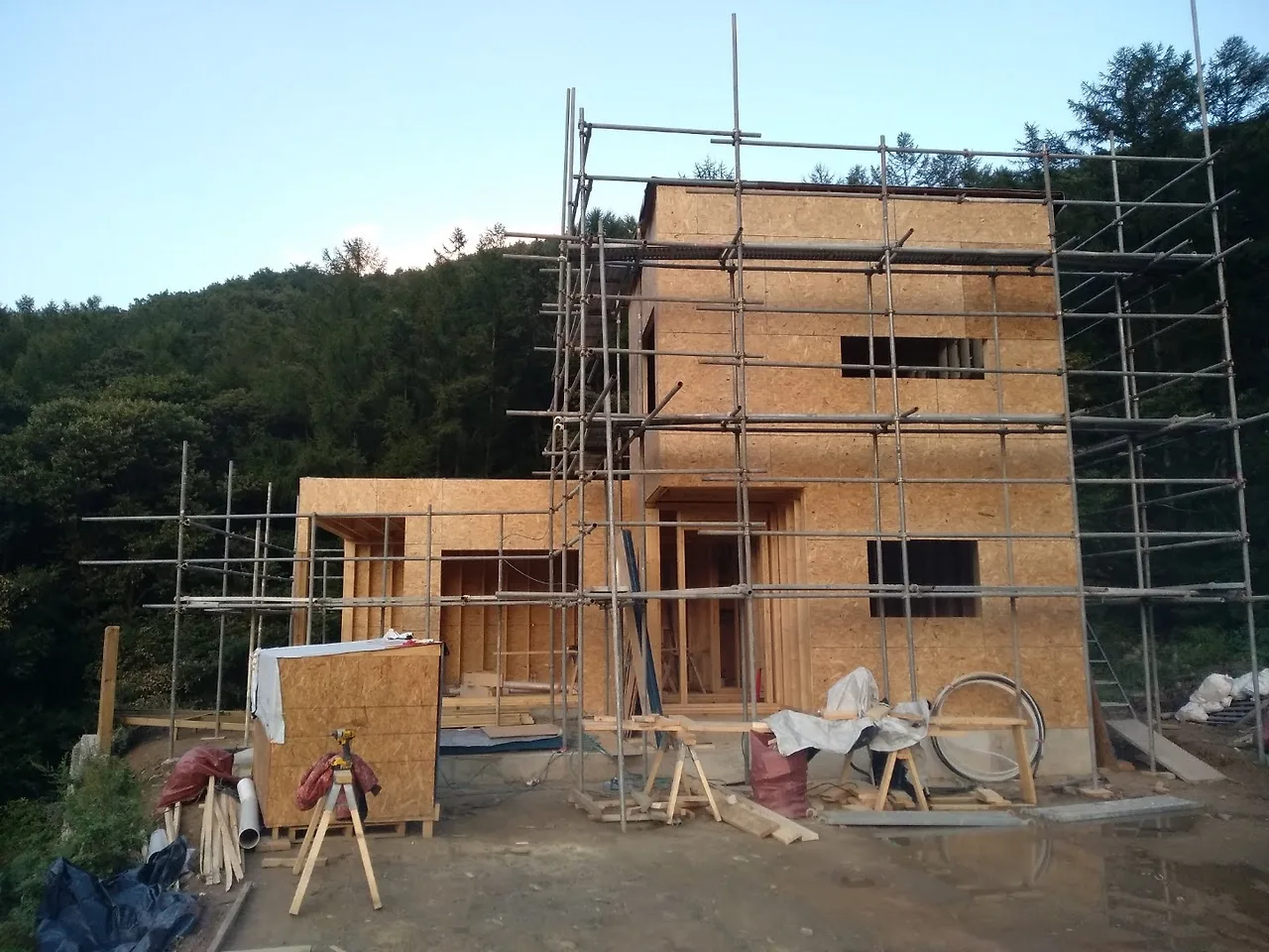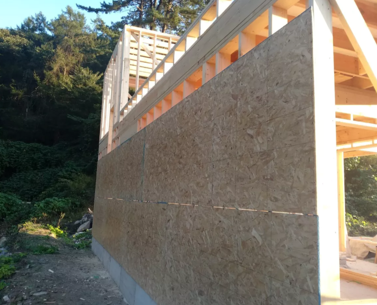 완성된 골조에 OBS합판을 붙여서 벽체를 만든다. 1층을 빙둘러서 벽을 만든 뒤에 비계를 세우고 2층 골조에도 OBS한판을 붙이니 벽이 되었다. 비계라는 말은 저도 처음 들었는데 '높은 곳에서 공사를 할 수 있도록 임시로 설치한 가설물'이라고 한다. 공사할 때 지다가 보면 집을 빙둘러서 파이프가 있었는데 그게 '비계'였던 걸 이번에 알았다.