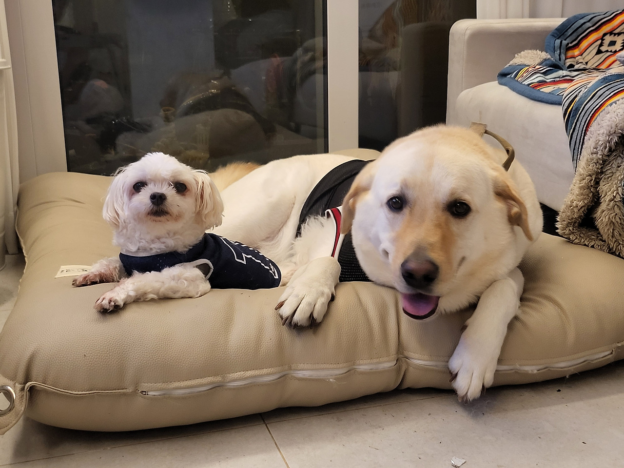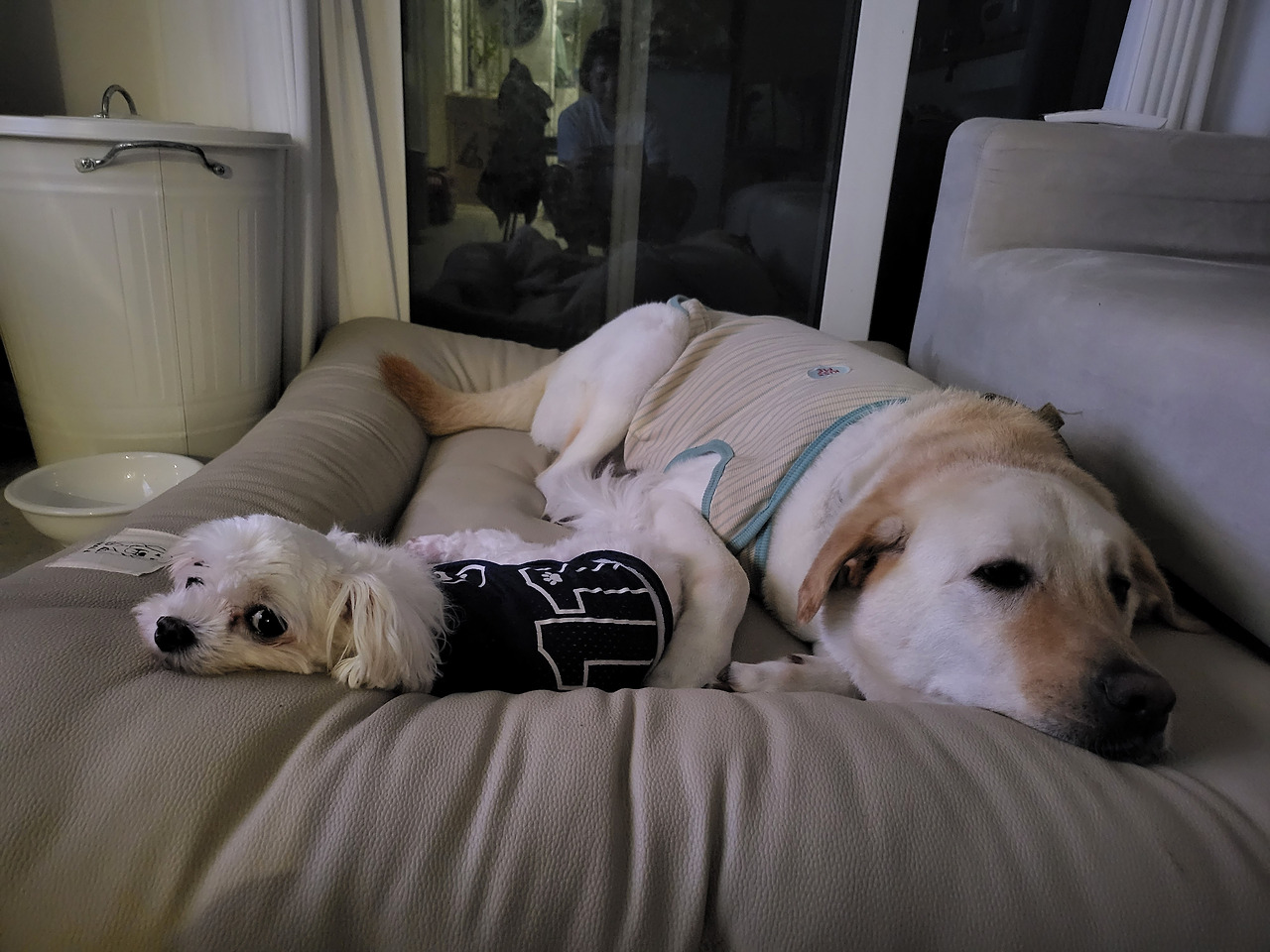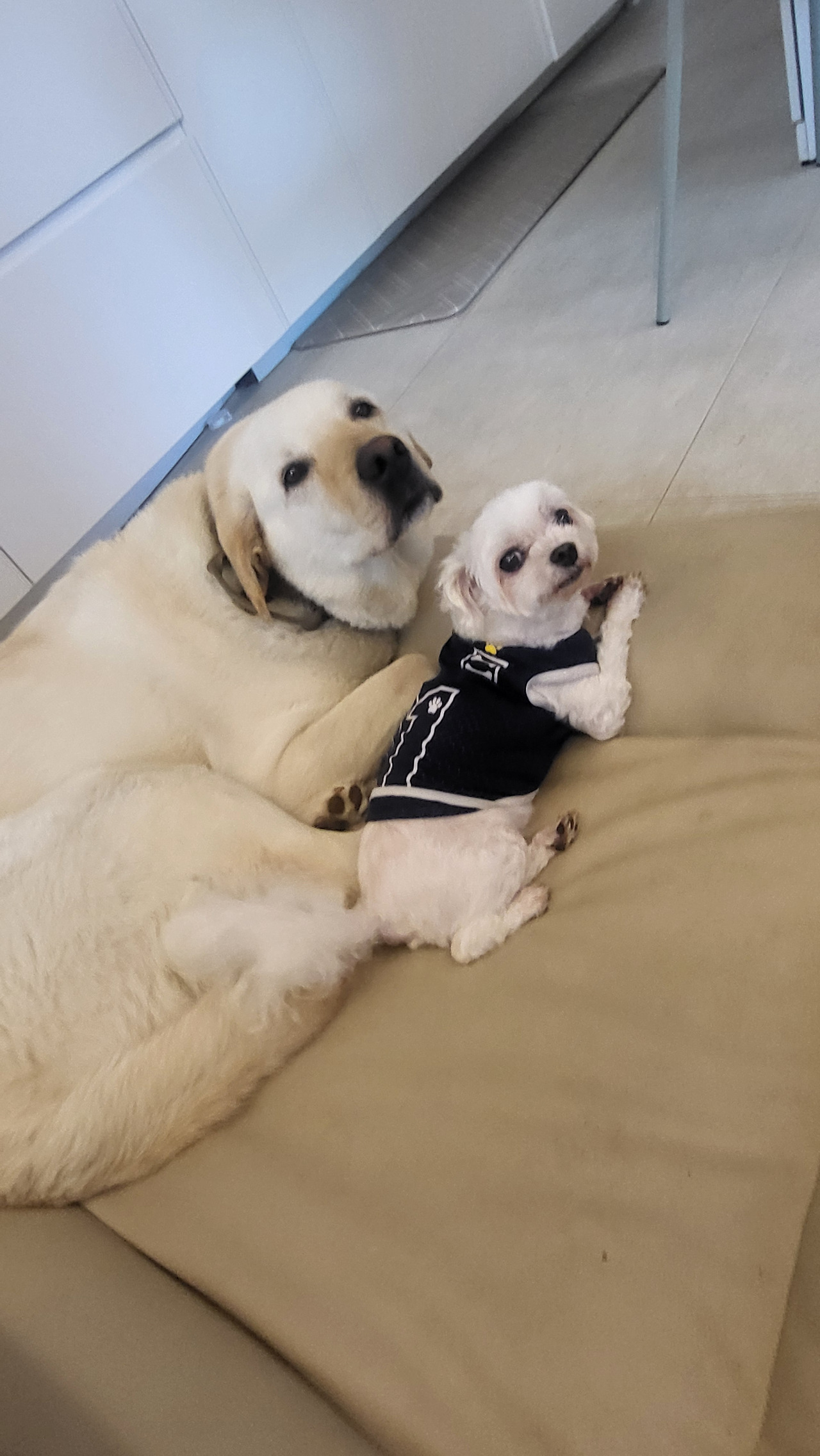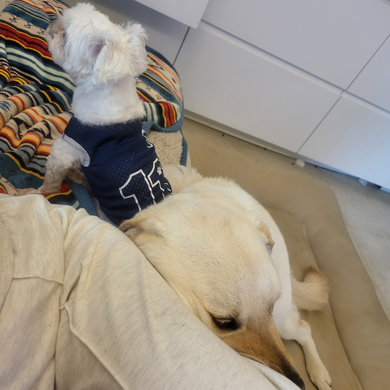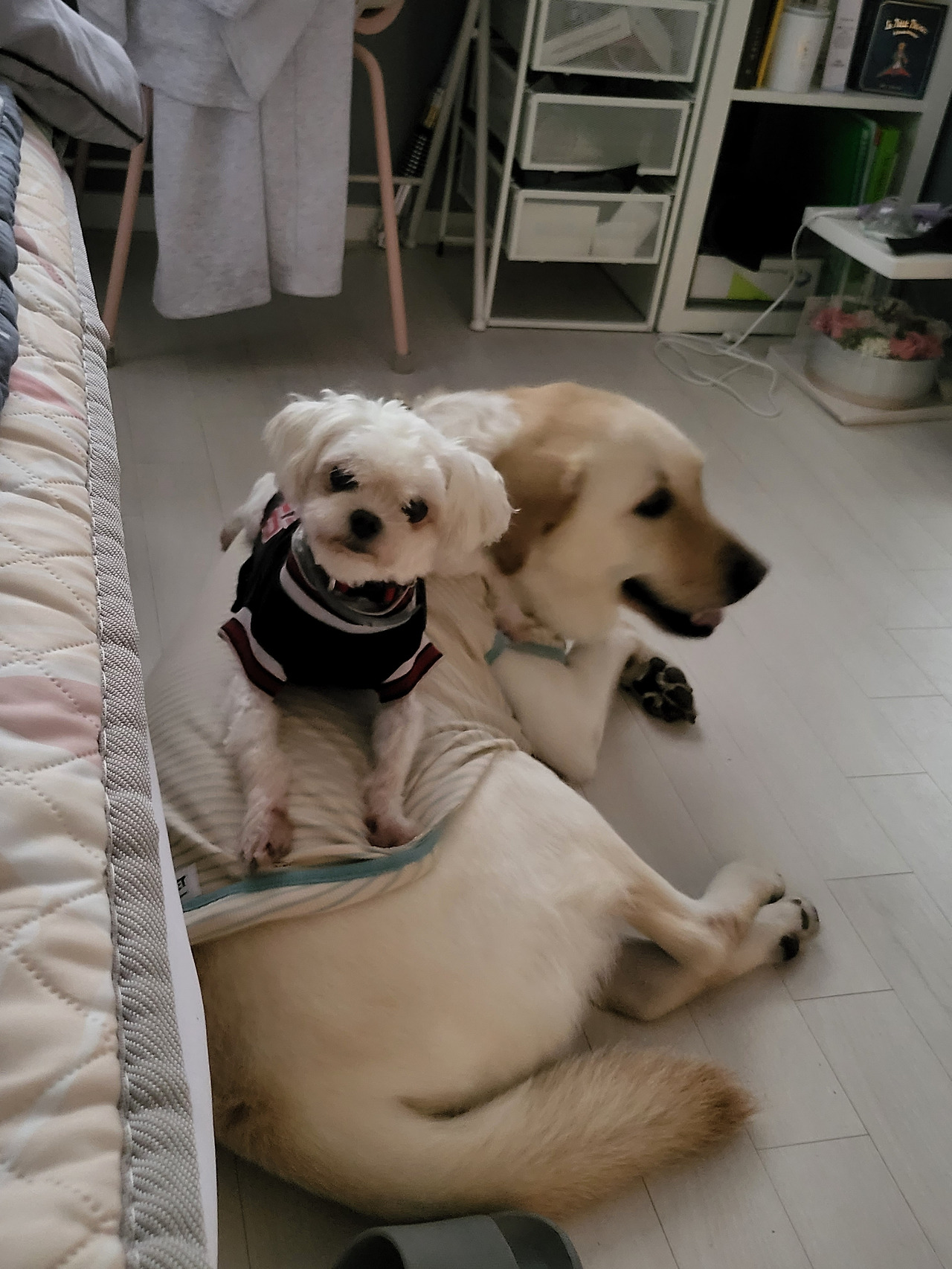 주중에 함께하지 못한 시간을 다 채우려는 듯 그렇게 몇 시간을 졸졸 따라다니고 나서야 내 다리를 내어주었다. 그러고 나면 형제들끼리 둘만의 시간이 시작되었다. 등치는 10배정도 차이나지만 너무나 우애 좋은 사랑스러운 반려견 형제들, 같은 곳을 보는 포즈도 반응도 똑같아서 웃음이 났다.