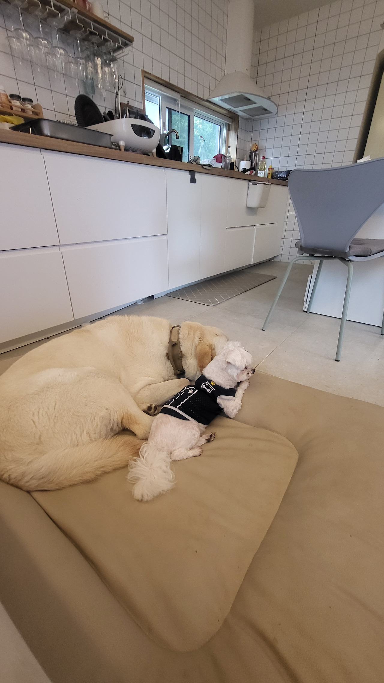 보리가 먼저 앉으면 해피는 그 옆에 가서 찰싹 붙어 잊는다. 해피가 먼저 앉아있으면 보리가 혹시, 해피가 다치기라도 할까 봐 조심조심 살포시 옆에 앉는다. 둘이 사이가 좋은 게 참 신기할 때가 많다. 아무래도 해피가 군기를 단단히 잡은 것 같다. 해피는 늘 보리를 깔고 않는다. 덩치 큰 보리는 누가 순둥이 아니랄까 봐 해피형 말이라면 꼼짝 못 하고 아래 깔려 있었다.