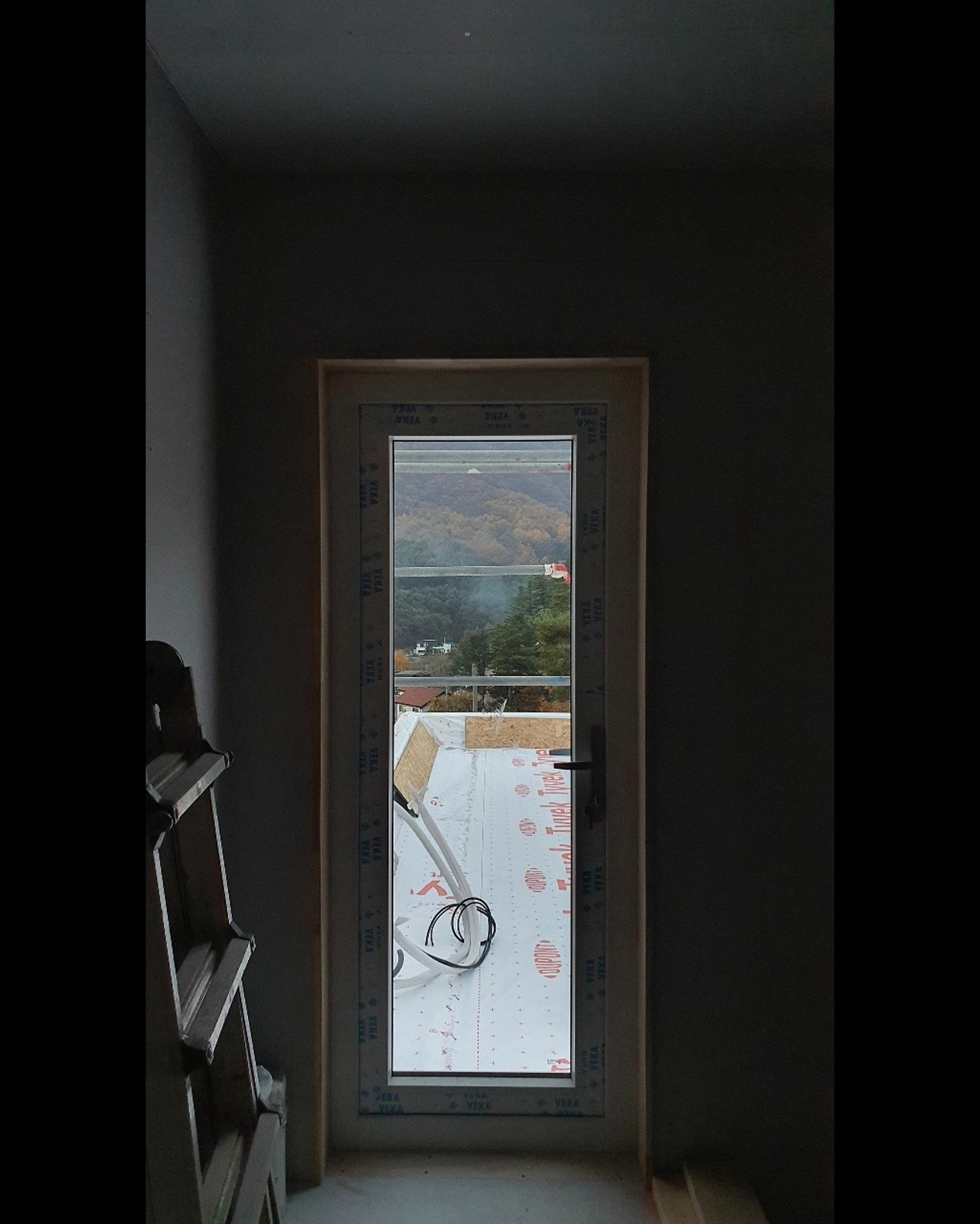 2층 남편(판다님) 방에는 멀리 보이는 산의 능선이 보일 정도로 큰 창을 2개나 달았습니다. 오른쪽에 픽스창은 소방창으로 화재 시에 소방관이 들어올 수 있을 정도의 큰 창을 설치하는 것이 필수라고 합니다. 나중에 생각한 건데 예산을 들여서라도 모서리 부분에 'ㄱ창'이었으면 더 좋았겠다...라는 아쉬움이 있기는 했습니다. 하지만 지금도 물론 만족합니다^^ 아침에 일어나면 창문을 활짝 열고 양평의 아침을 맞이하기에는 더할 나위 없이 좋으니까요. 2층 테라스문은 유리문으로 밖으로 나가면 루프탑 카페가 부럽지 않은 장소가 될 예정입니다.