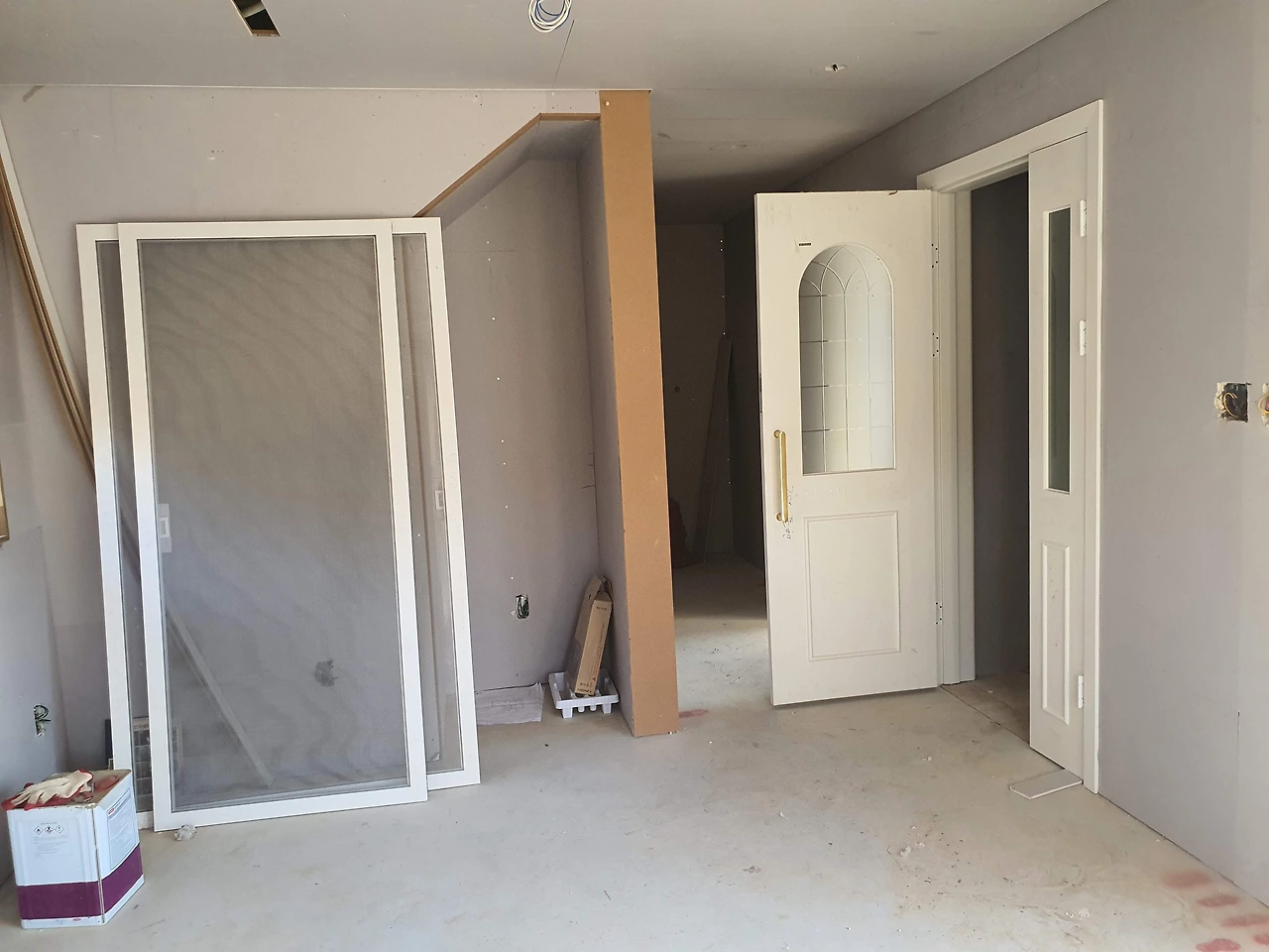내부단열로 글라스울을 꼭꼭 채우고 상량판을 넣고 석고보드 마감을하였습니다. 이제는 창호와 문을 달게 됩니다.