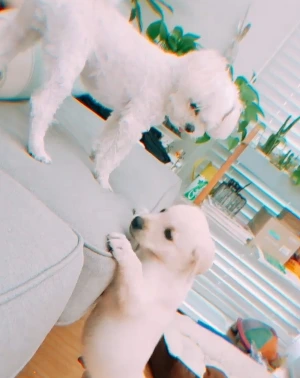 당연히 해피가 형이었고 아무것도 모르는 아기강아지인 보리가 같이 놀자고 까불면 으르렁대고 건들지 말라면서 소파 위에서 서열정리를 하였습니다.
