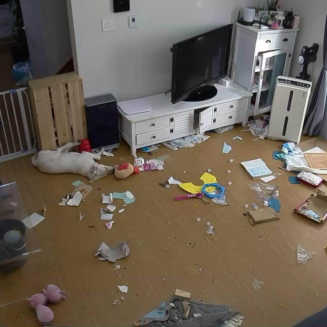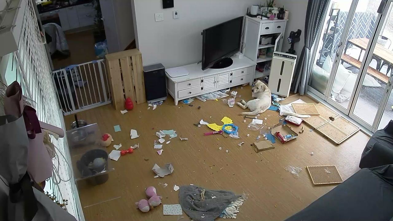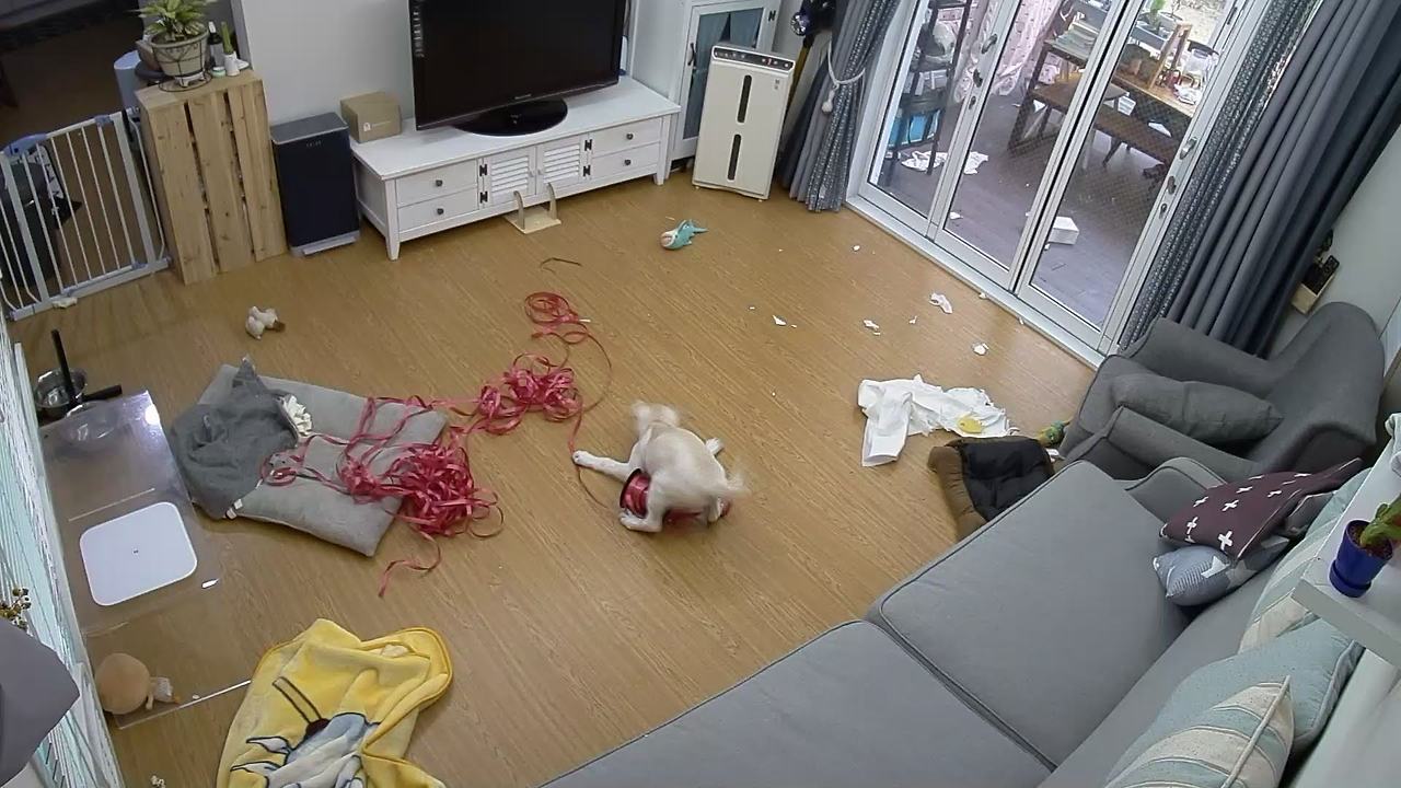가끔 사고치는지 감시하려고 카메라를 통해 본 우리 집 거실은 난장판이었습니다. 이럴 때면 사이렌을 울리고 스피커로 "김보리" 라고 부릅니다. 처음에는 깜짝 놀라서 멈추더니 몇번 당하고는 영리해서 우리가 집에 없는 걸 알고는 신경도 안 쓰고 여전히 사고를 칩니다.