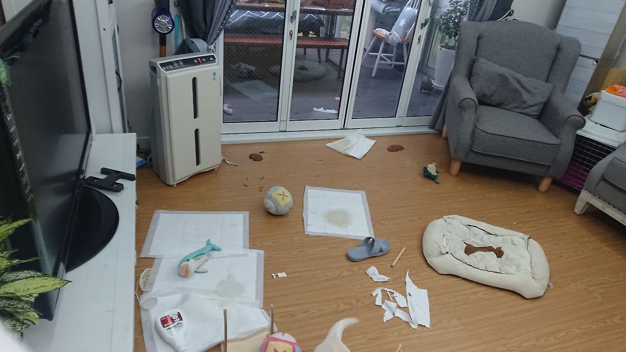 퇴근해서 이정도 어질러놓은 것은 애교에 불과합니다. 낮이면 혼자서 대형사고 치는 보리 덕분에 거실에 홈CC를 설치하였습니다.