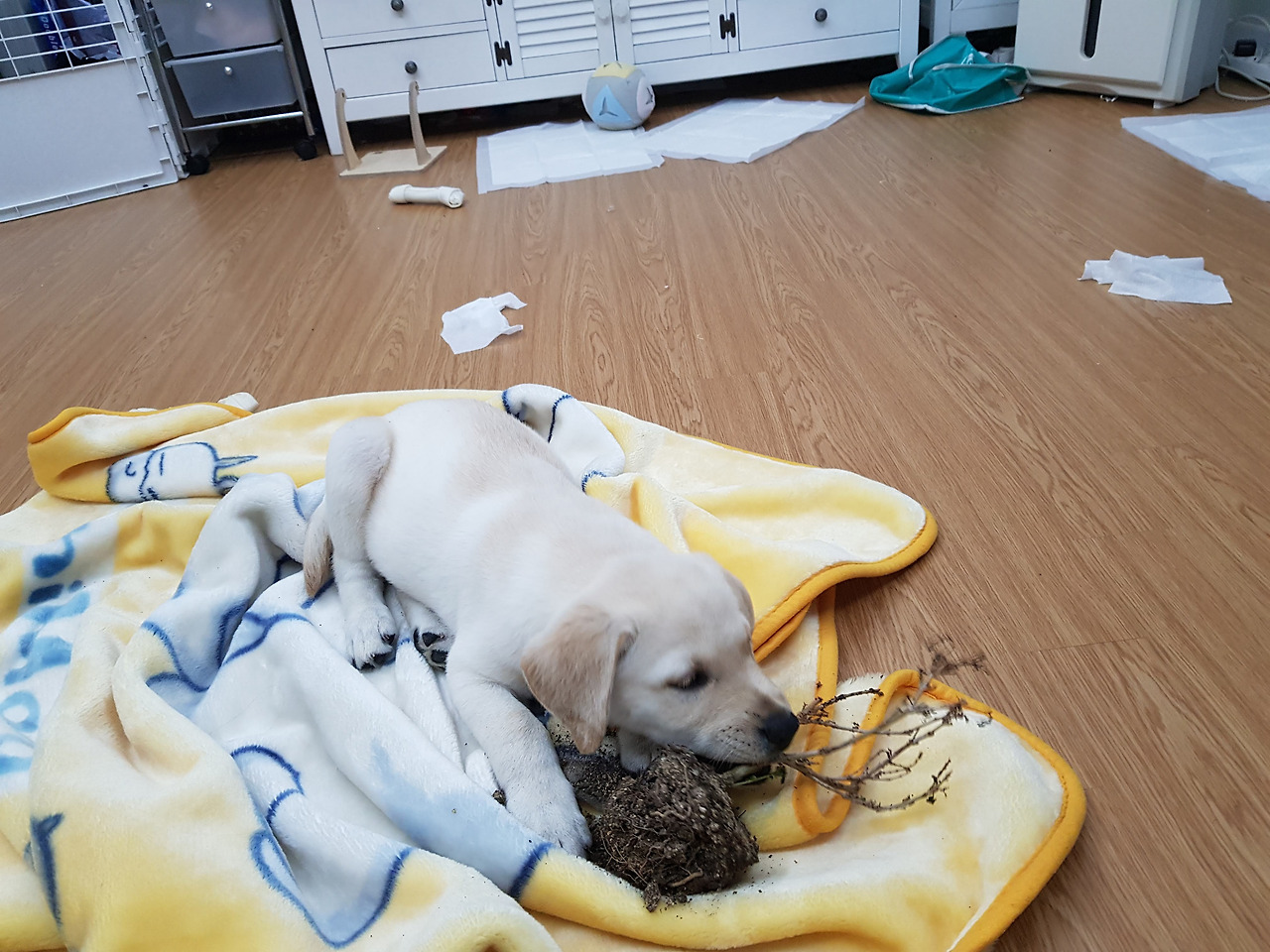 어느날은 이가 간지러운지 배변패드며 인형들을 하루에 하나씩 파헤쳐 놓습니다. 우리 불쌍한 보리의장남감 인형들은 어느날은 코가, 눈이 하나씩 없어지더니 결국은 하늘나라로 갔습니다.