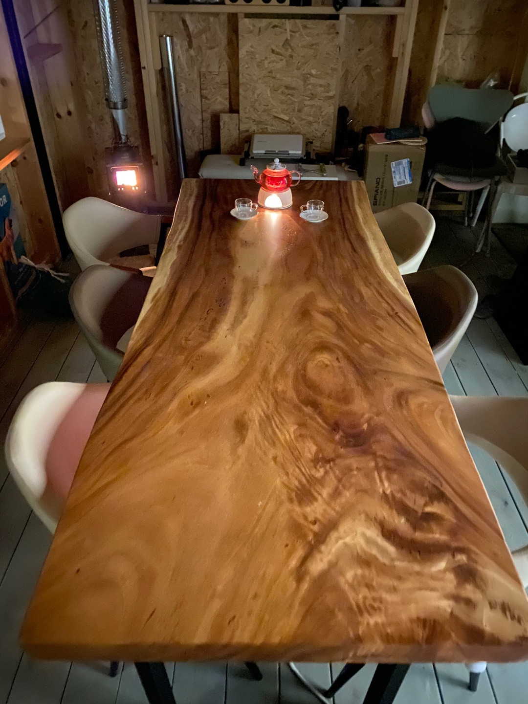 테이블은 고민 끝에 우드슬랩테이블로 정했다. 그런데 우드슬랩은 테이블 상판이 통원목으로 되어 있어서 무늬가 모두 다른것이 특징이고 멋이다. 그래서 인터넷으로는 가늠이 쉽지 않다. 자연적으로 생긴 무늬와 옹이와 크랙을 확인하러 직접 용인모현에 있는 매장에 갔다. 이것저것 둘러보고는 2미터짜리 상판을 직접 픽업해 왔다. 다리조립은 판다님이 하면 되니... 배송비 벌었다~ㅋ 직접 골라와서 그런지 맘에 쏙 들었다^^
