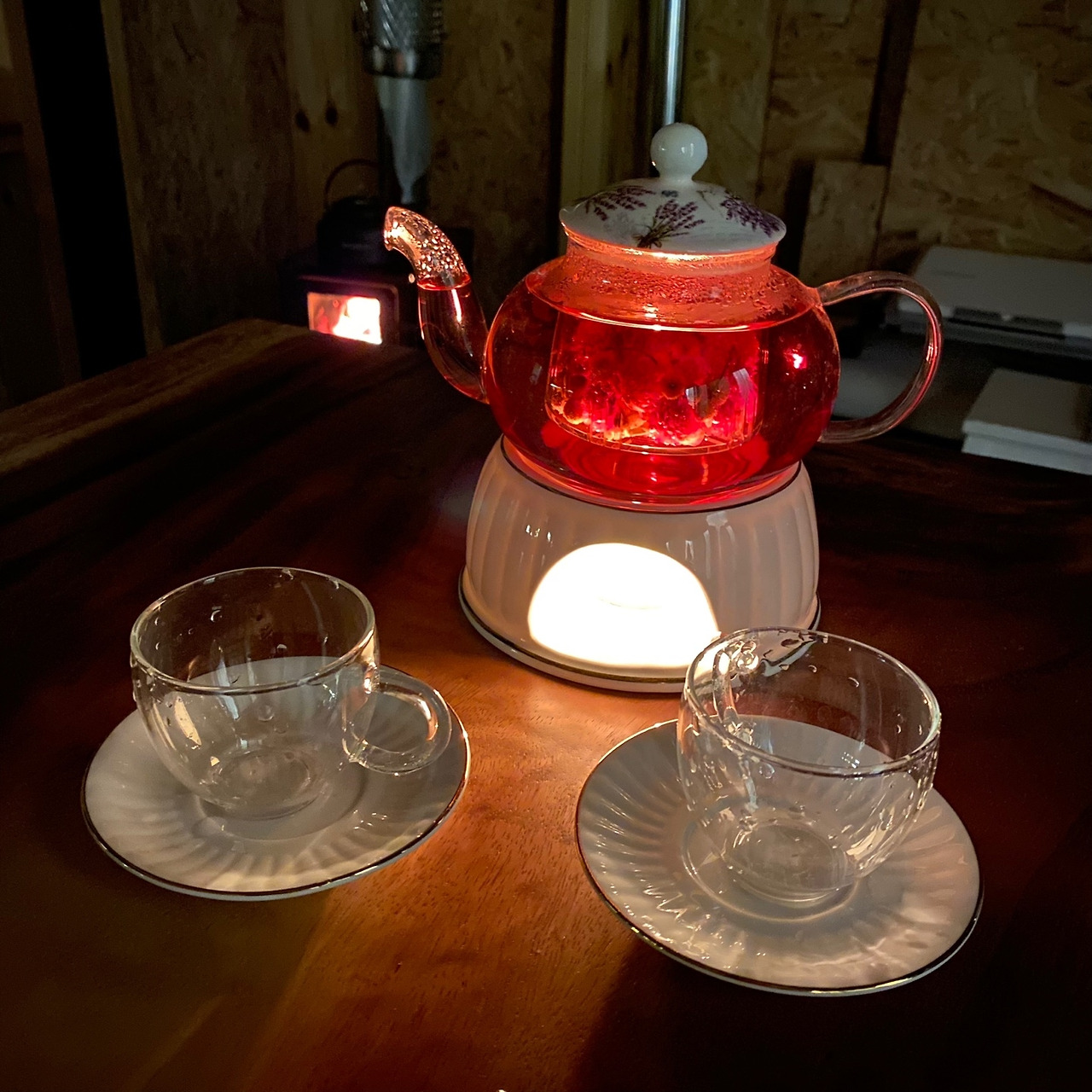 우드슬랩과 난로설치를 끝내고 저녁을 먹고 나니 좀 아쉬워서 고구마를 구워 먹었다. 역시, 군고구마는 꿀맛이다. 화목난로에 올려놓은 주전자에서 물이 보글보글 끓었다. 커피를 마실까 하다가... 오랜만에 꽃차를 마셔보기로 했다. 주섬주섬 유리다관을 챙겨 와서 세팅을 해본다. 올해는 둘 다 바빠서 꽃차 만들기를 한 번도 못했다. 마당에 메리골드가 지천이데... 여유가 없었다. 작년에 만들어둔 꽃차로 분위기를 냈다.