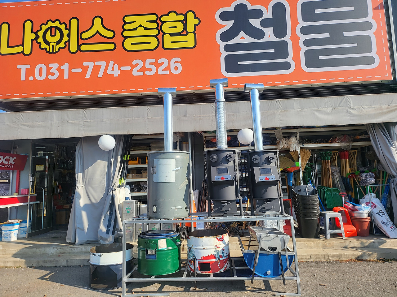 그 후로 오랜만에 출근길이었다. 가는 길에 스타벅스가 있어서 드라이브 스루로 커피와 샌드위치를 하나씩 사서 가게로 행했다. 날도 너무 좋아서 일터가 아니라 소풍을 가는 기분이었다. 도착하자마자 입구에 있는 천막을 치우니 난로가 반겨주었다. 겨울대비 전략상품이라 문 앞에 떡하니 진열해 놓은 것이었다. 나란히 서있는 모습이 마치 난로 로봇 삼 형제 같기도 했다.