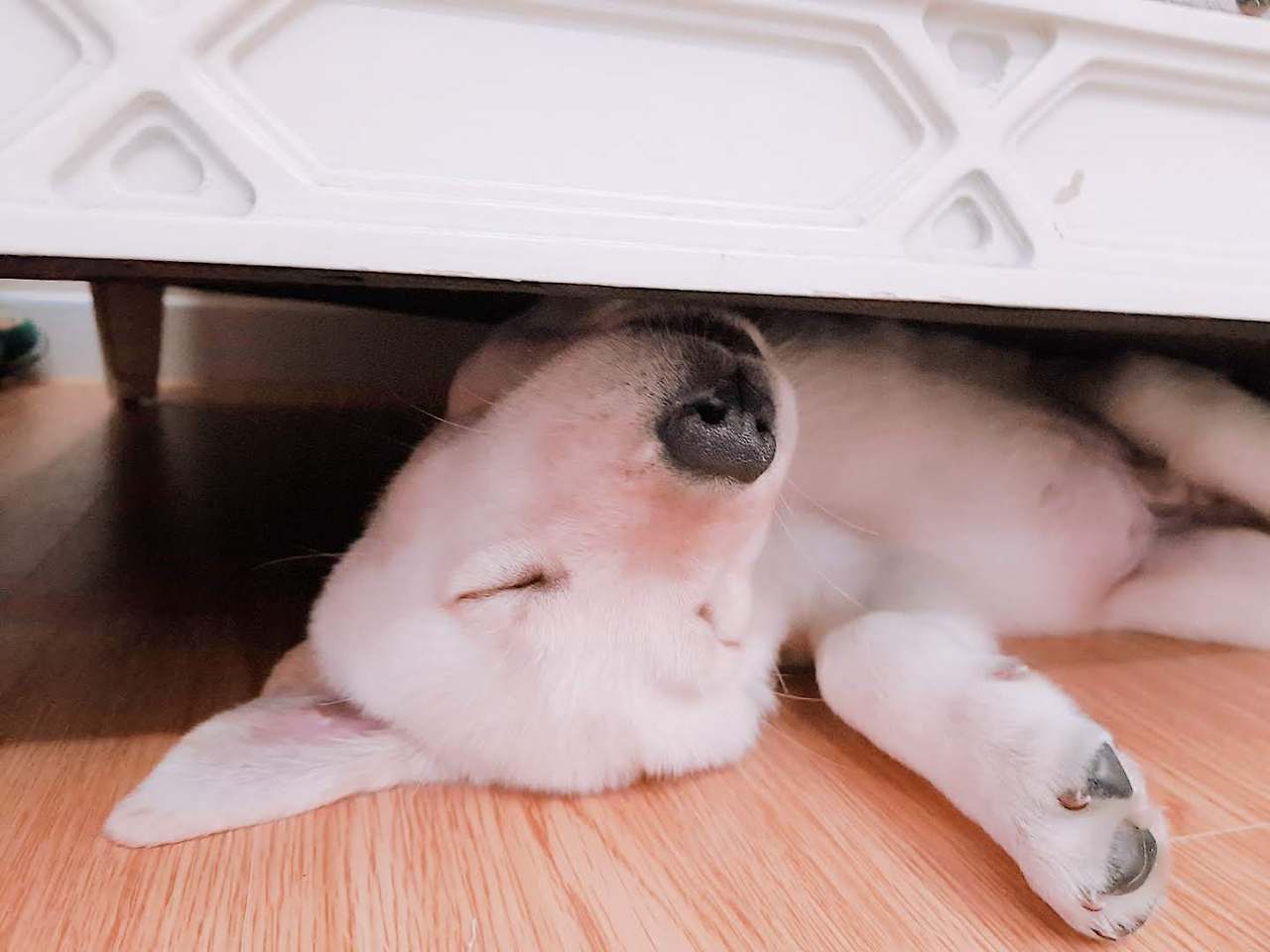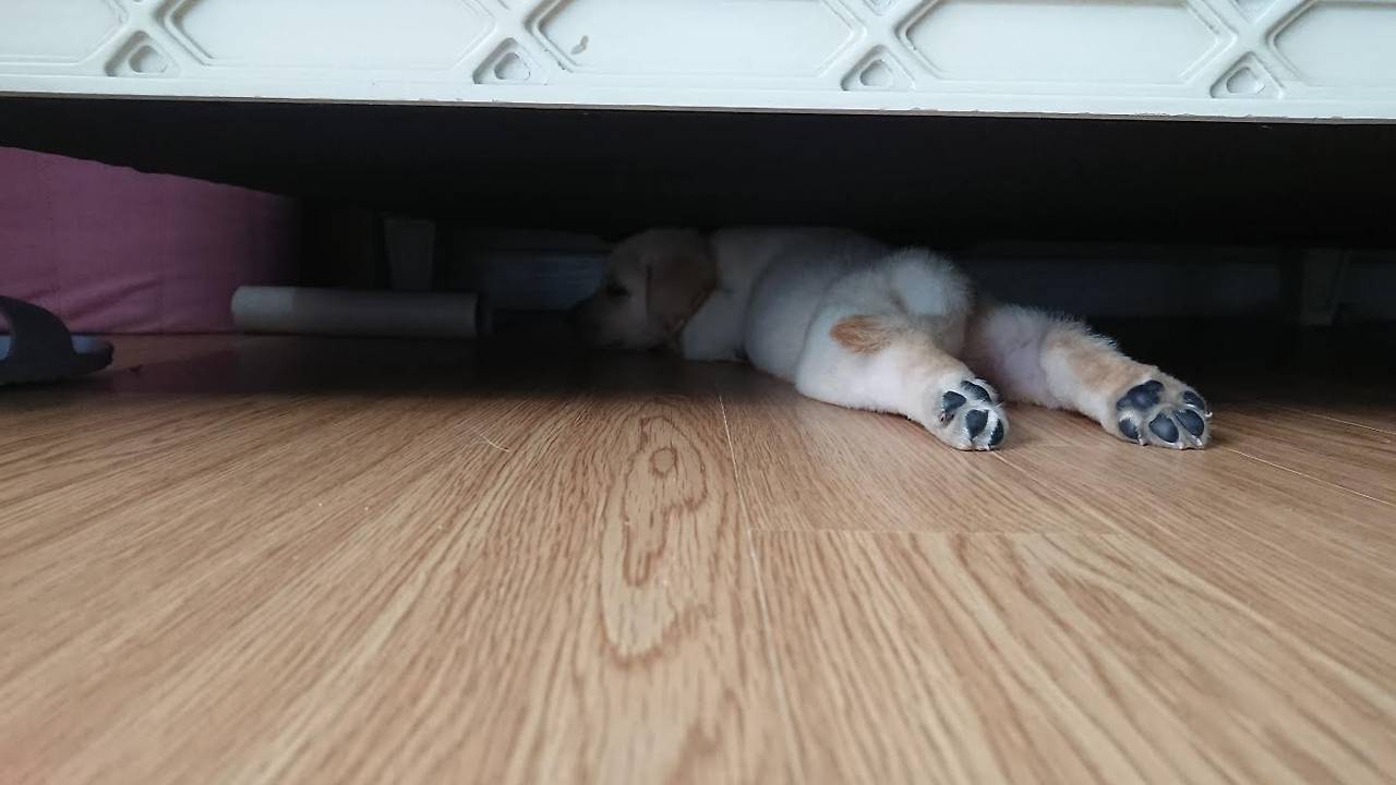 머리부터 넣는데 엉덩이가 끼어서 안 잘 들어가서 낑낑대며 꾸역꾸역 소파아래로 들어가는 모습이 얼마나 귀여운지 모릅니다. 소파로 들어갈 때 예전과 다르게 몸이 꽉 끼니까 이상하다고 생각은 했겠지요? 그냥 보리는 소파아래로 들어가고 싶을 뿐입니다. 겨우 몸을 욱여 넣어서 소파아래로 들어가긴 했는데... 꽉 끼어 있는 모습이 안쓰럽기까지 합니다.