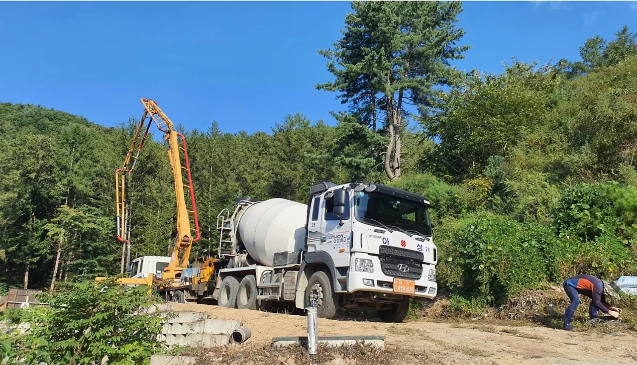 매트기초를 위해 철근과 기초작업 후에 레미콘이랑 펌프카로 시멘트를 붓는 공사를 진행하였다.