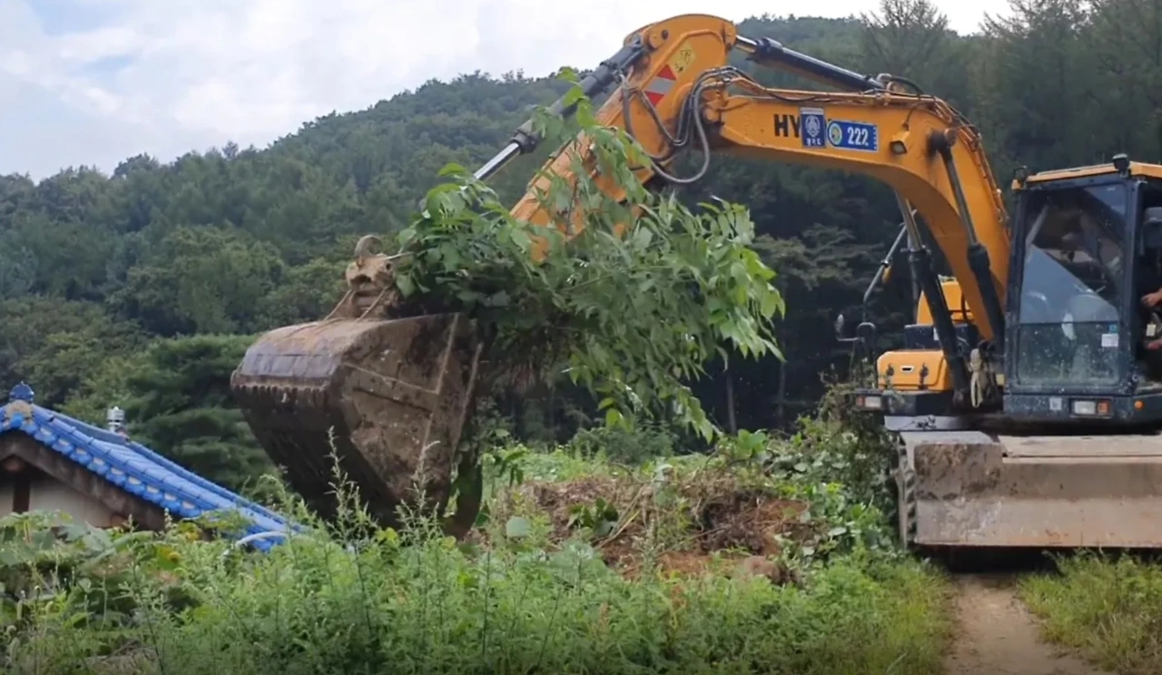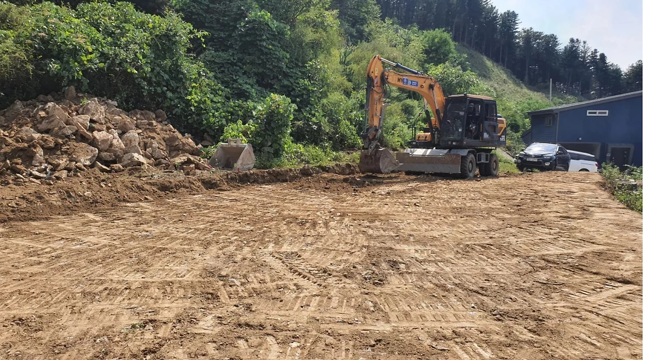 아침 일찍 대형 포크레인이 와서 부지정리를 하였다. 잡초들이 무성하고 울퉁불퉁했던 땅이 굴착기의 손길 몇 번에 이렇게 말끔하게 정리가 되다니! 굴착기를 마치 손처럼 쓰시는 기사님이 왠지 너무 멋지다.