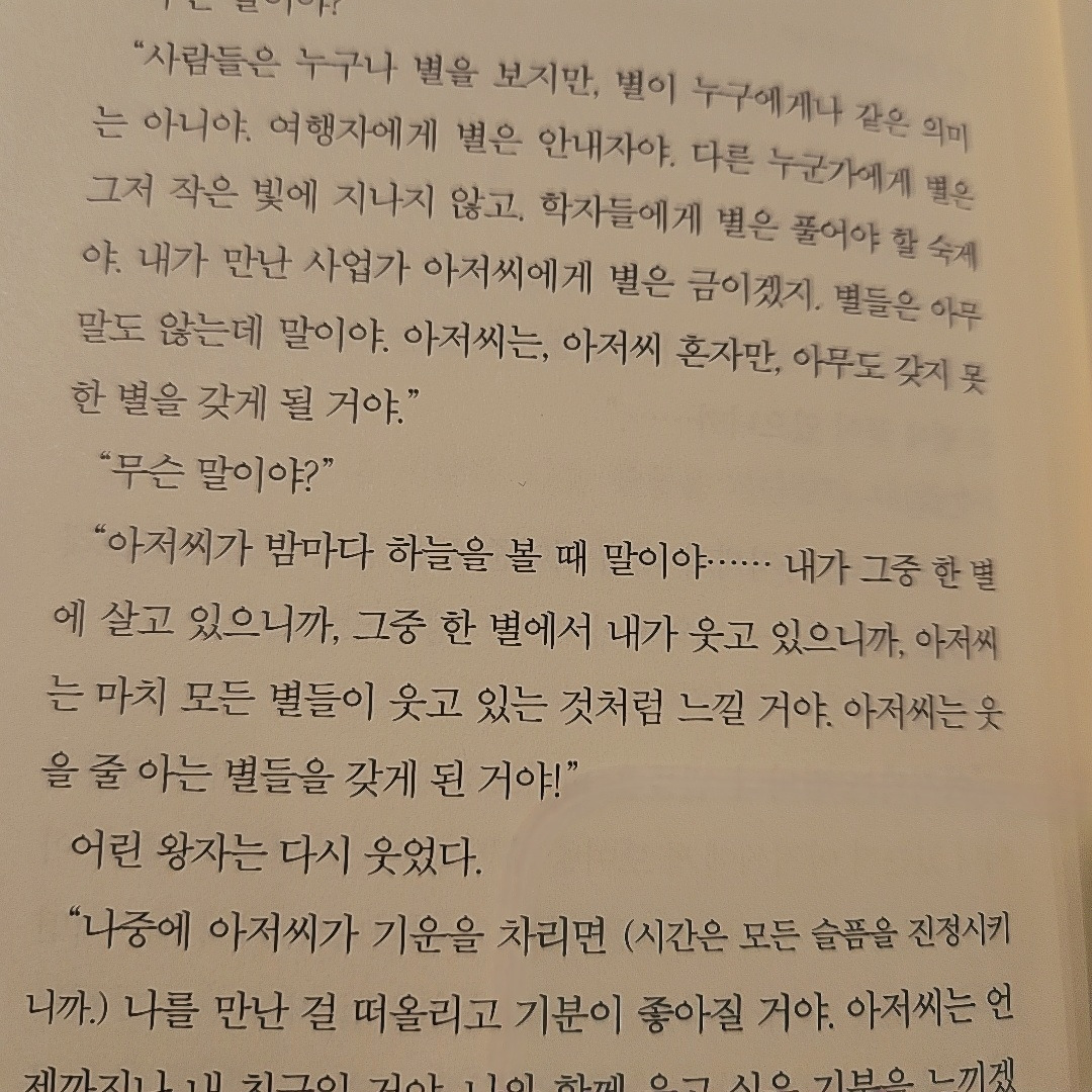 어린왕자가 자신이 떠나는 것을 아쉬워하지 말라며, 아저씨에게 특별한 별이 생기는 것이라 위로하는 장면이었다. 어린왕자를 알게 됨으로써 아무런 의미가 없었던 존재가 새롭게 보이는 것, 진짜 중요한 건 눈에 보이지 않는다는 것. 당신이 마음을 쏟은 만큼 어떤 것이 의미를 가지게 된다는 것.