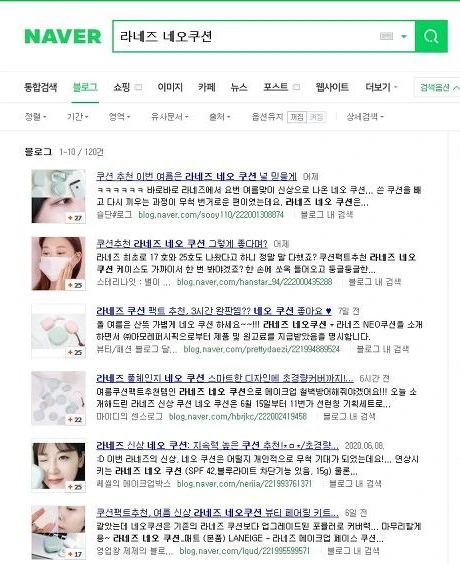 또한 이미 라네즈 네오쿠션은 라네즈에서 N사 블로그 후기 작업을 하고도 있겠지만 120건이 포스팅되어있다. 하지만 이 중에서도 실제 내 돈 내산(내 돈 주고 내가 산) 후기들도 많을 것이므로 라네즈 직원들은 이미 불철주야 이것들을 다 보고 있을 것이고.