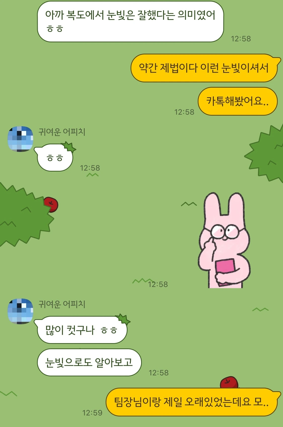 일을 잘하는 팀장님이, 나를 누구보다 아껴주셨던 팀장님이 인정해주셔서 너무 좋았다. 그간 있었던 직장 생활의 설움이 눈 녹듯 사라지는 기분이었다. 나를 막내로 받으시고 하나하나 가르쳐주시고, 일 하나를 주더라도 명확한 방향성과 목표를 일러주셨던 팀장님께 꼭 팀장님 밑에서 배웠기 때문이란 말을 전해드리고 싶었다.