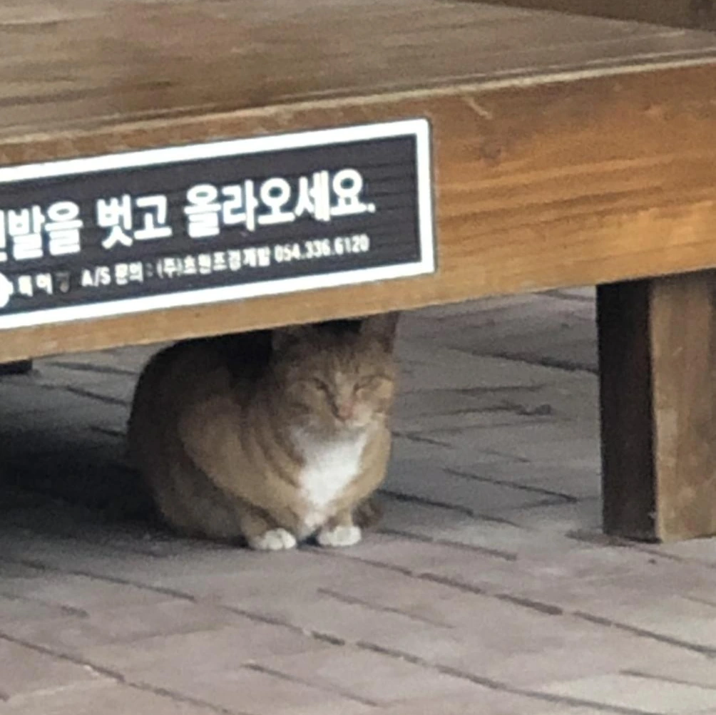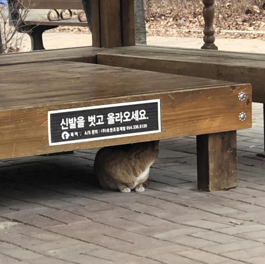 고양이는 공원 정자 밑에 웅크리고 있었는데 하얀 양말이 눈에 띄었다. "신발을 벗고 올라오세요." 문구 바로 밑에 있어서 절묘했다. 마치 "신발도 안 신고 올라가지도 않을 건데?"라고 말하는 것 같았다.