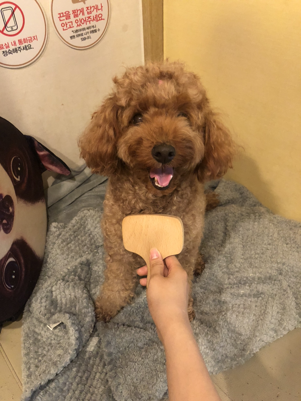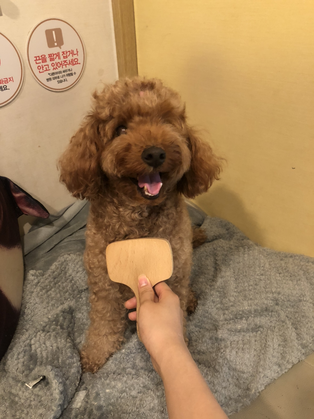 넷째날에는 면회 시간 끝나고 선생님 품에 돌려보내니 가만히 있는다. 선생님이 “이제 해피도 적응했나 봐요” 아는 체를 하니 또 있는 힘껏 낑낑 거린다. 역시 푸들은 다 알아듣는다.
