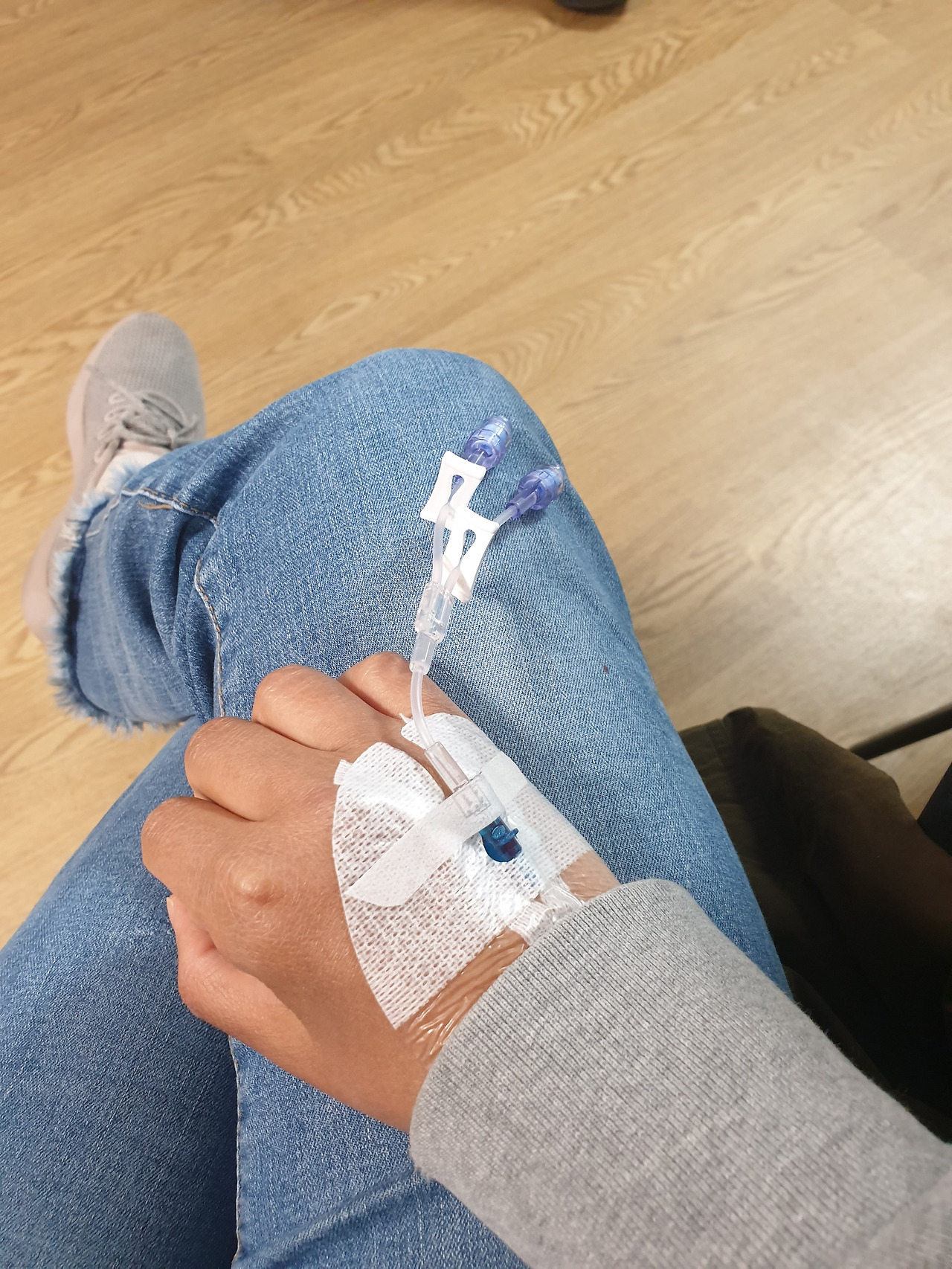 처음 달아주고 간 수액, 양손에 찔러 넣은 투약용 바늘. 각각 다른 색깔로 해주겠다며 생색내던 간호사가 생각난다.