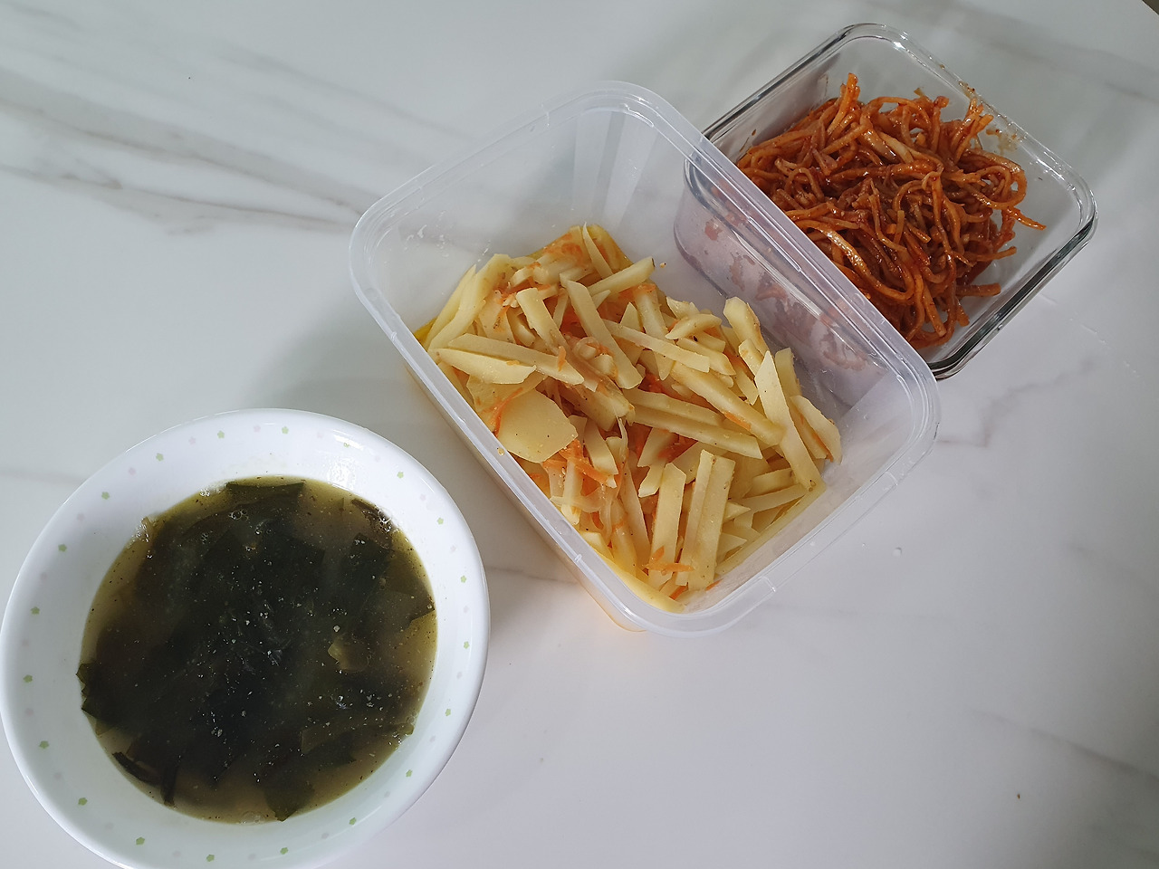 그래서 오늘의 아침식사 메뉴는 들깨미역국, 감자채볶음, 진미채볶음.