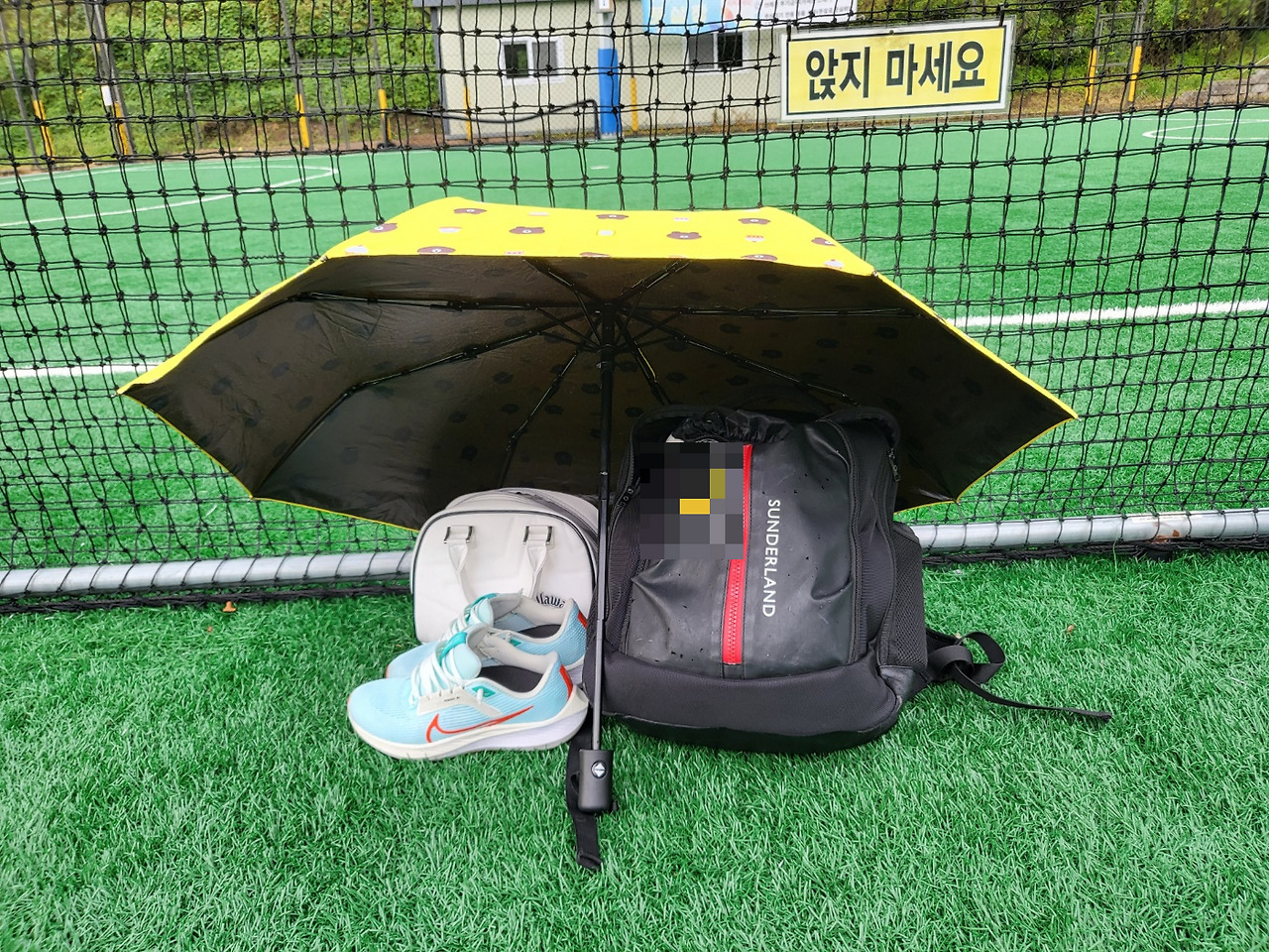 느닷없이 소나기가 내린다. 다행히 차에 우산이 있다. 잠깐 기다리니 비가 멈춘다. 해는 쨍하지 않아 오히려 좋다. 안 그래도 기미가 잘 올라오고 햇볕 알레르기가 있는 나에게는 바깥 운동하기 딱 좋은 날씨다. 2시간 동안 아들이 찬 공을 던져주고, 필요하면 패스도 해줘야 하는 상황이라 더운 것보다는 100배 낫다.