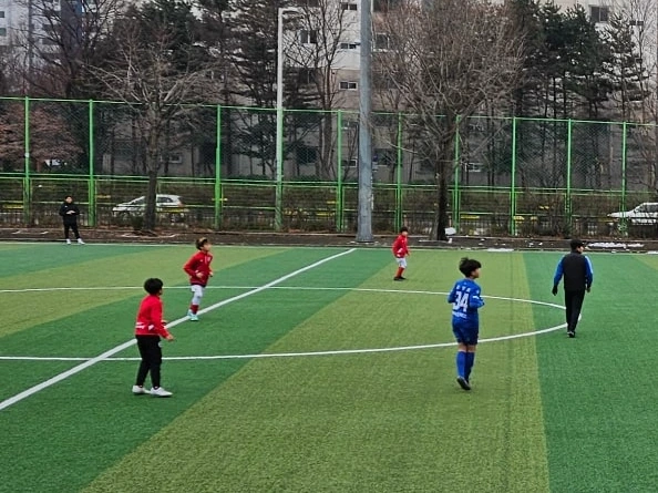12월부터 시작된 진학경기. 오늘은 일산 축구 명문, 백마중학교 1학년 형들과의 경기다. 집하고 가까워 이동거리가 짧아 좋다. 마침 시간이 되시는 시어머니께서도 손자의 경기를 보기 위해 남편과 함께 오셨다. 감기 몸살로 컨디션이 빵점인 엄마는 약 한 봉지를 입에 털어놓고 움직여 본다.
