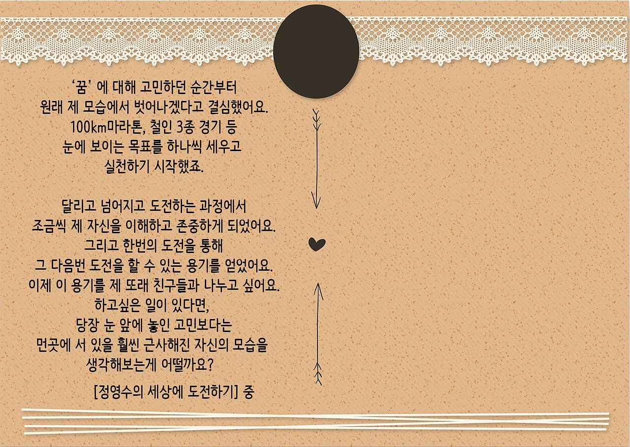 그 도전의 끝에는 어떤 ‘정영수’가 기다리고 있을지 모르겠어요. 단순히 좋은 추억을 얻은 제 자신이 있을 수도 있고, 계속해서 꿈꾸고 더 큰 도전을 하는 제가 있을 수도 있겠죠.
