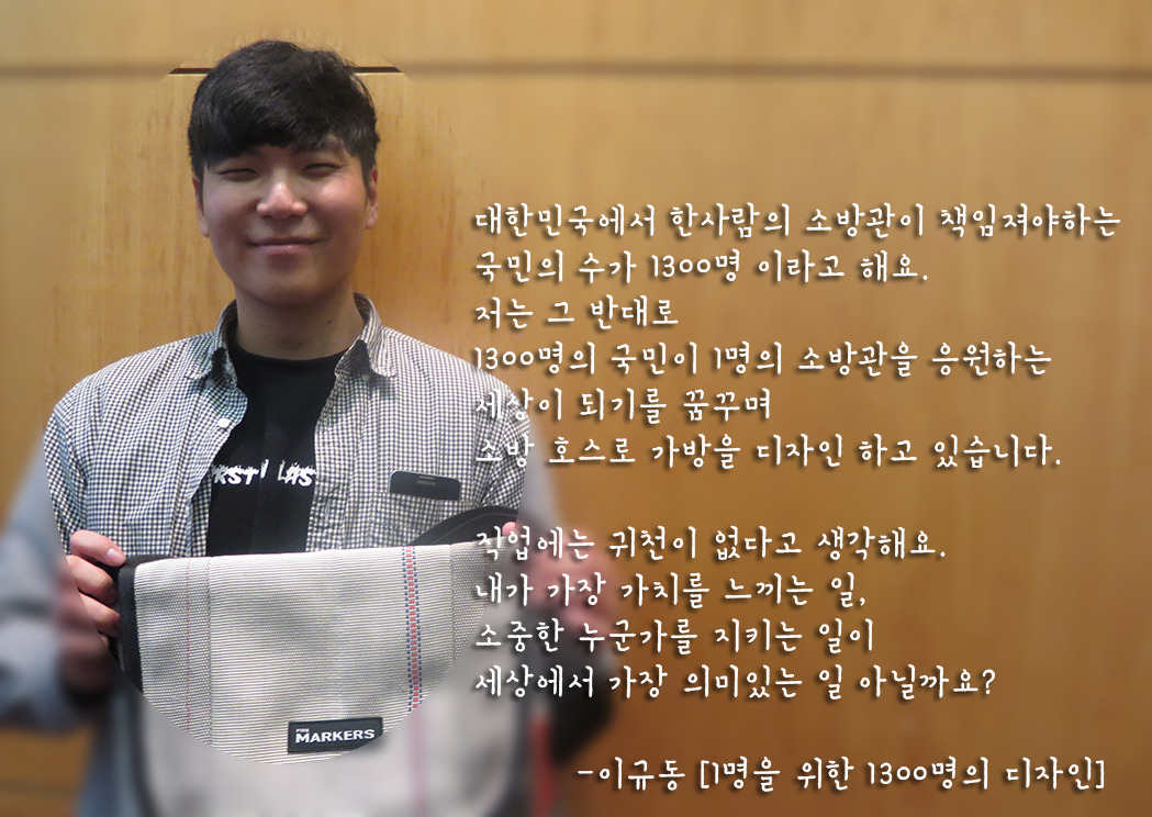 ‘1300대 1’입니다. 대한민국에서 한 사람의 소방사가 책임져야 할 국민의 수가 1300명이라고 해요. 저는 그 반대로 1300명의 사람이 한명의 소방사를 응원해주는 세상이 오기를 꿈꾸는 디자인을 하고 있습니다.