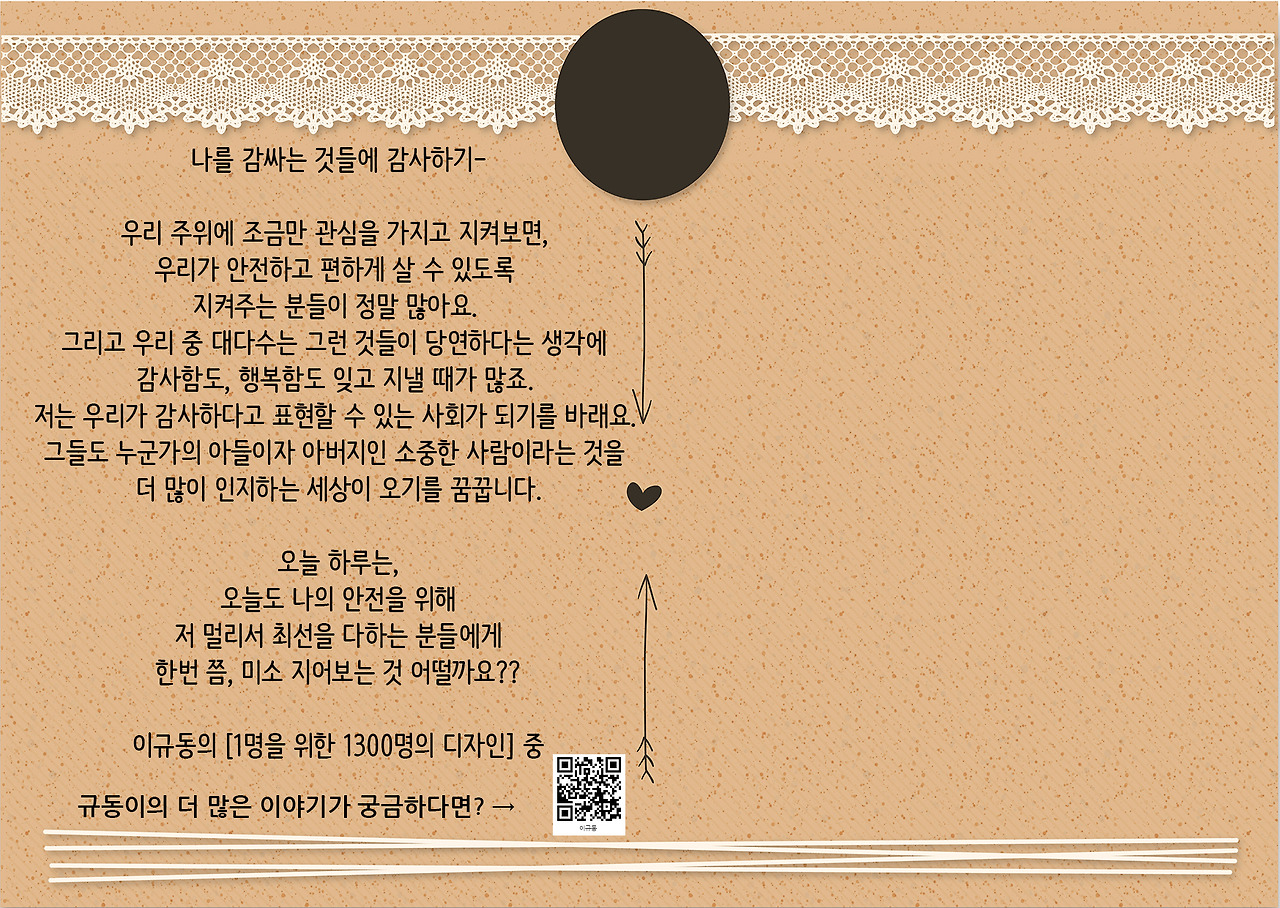 우리 주위에 조금만 관심을 가지고 지켜보면, 우리가 안전하게 편하게 살 수 있도록 지켜주는 분들이 정말 많아요. 그리고 우리 중 대다수는 그런 것들이 당연하다는 생각에 감사함도, 행복함도 잊고 지낼 때가 많죠.