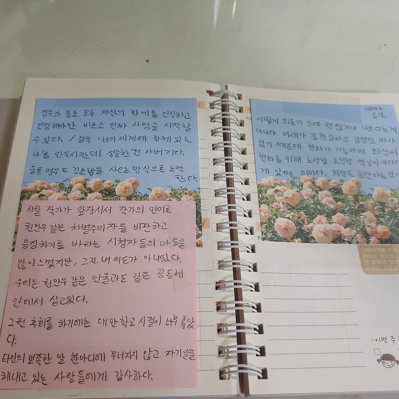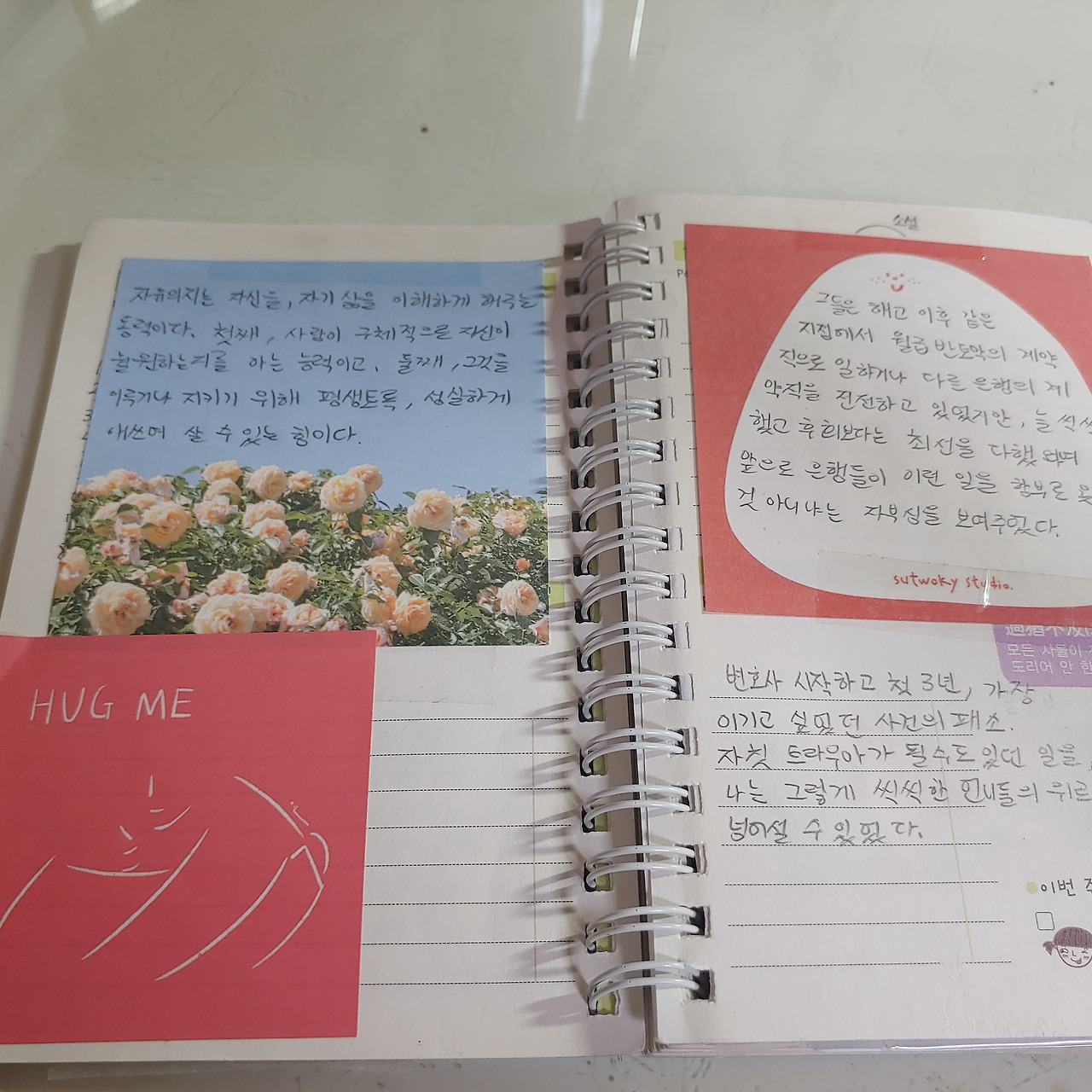 제 취미 중 하나는 기사를 읽고 정말 마음에 드는 구절이 있으면 메모지에 필사를 하고 노트에 붙여서 모아두는 거예요. 일종의 스크랩이라고 할 수 있겠는데요.(사실 스크랩이라고 거창하게 부르기엔 굉장히 소소하지만요) 원래는 좋은 대목이 있으면 화면 캡쳐를 많이 했어요. 근데 이렇게 캡쳐를 한번 '찰칵'한 뒤에 다시 찾아보지 않더라고요. 핸드폰을 바꾸면 데이터가 날아가기도 하고요. 그래서 직접 적기 시작하니까, 새로운 내용을 적을 때마다 전에 쓴 내용을 펼쳐보면서 더 자주 구절을 읽게 되더라고요. 핸드폰을 바꿔도 이 노트는 제 책상에 있으니까 잃어버릴 일도 없고요.