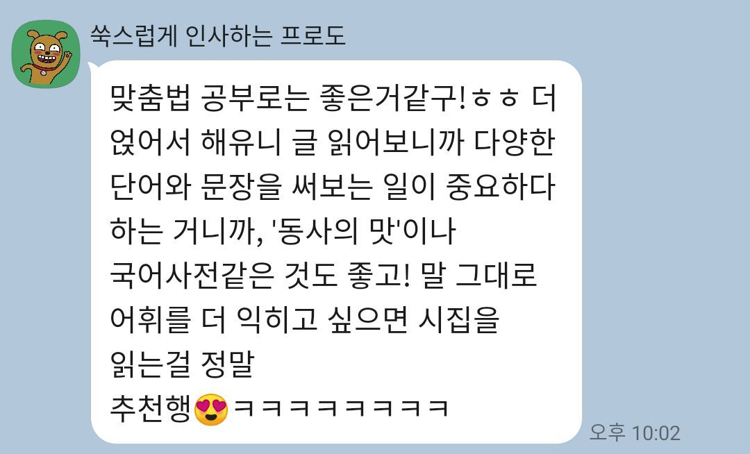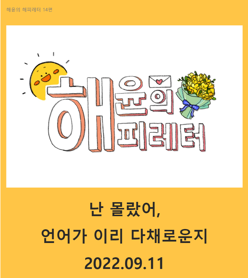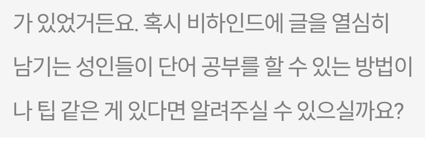 저는 근데 단어량을 늘리는데는 글쓰기밖에 없다고 생각해요. 저희가 평소에 대화에서 쓰는 단어들은 한계가 정해져 있잖아요? ㅎㅎ 그런데 글 쓰기를 하면 결국 독자에게 닿고 싶고, 더 정확하게 내 뜻을 전달하고 싶은 거기 때문에 단어에 더 많이 힘을 쏟고 고민하게 되거든요.