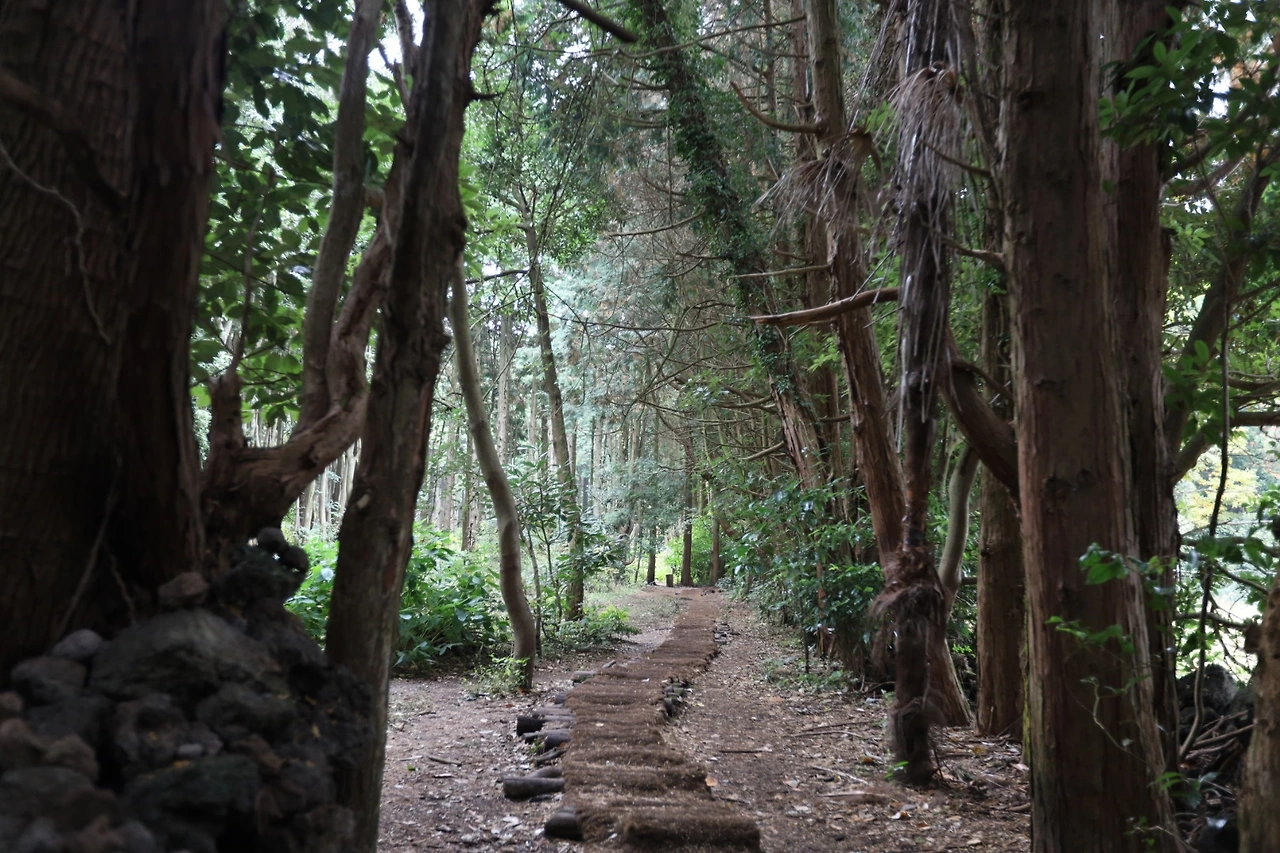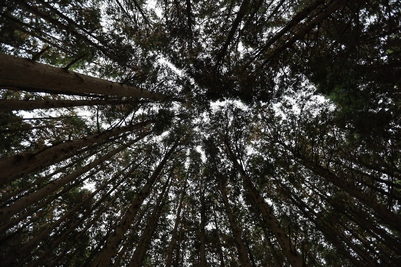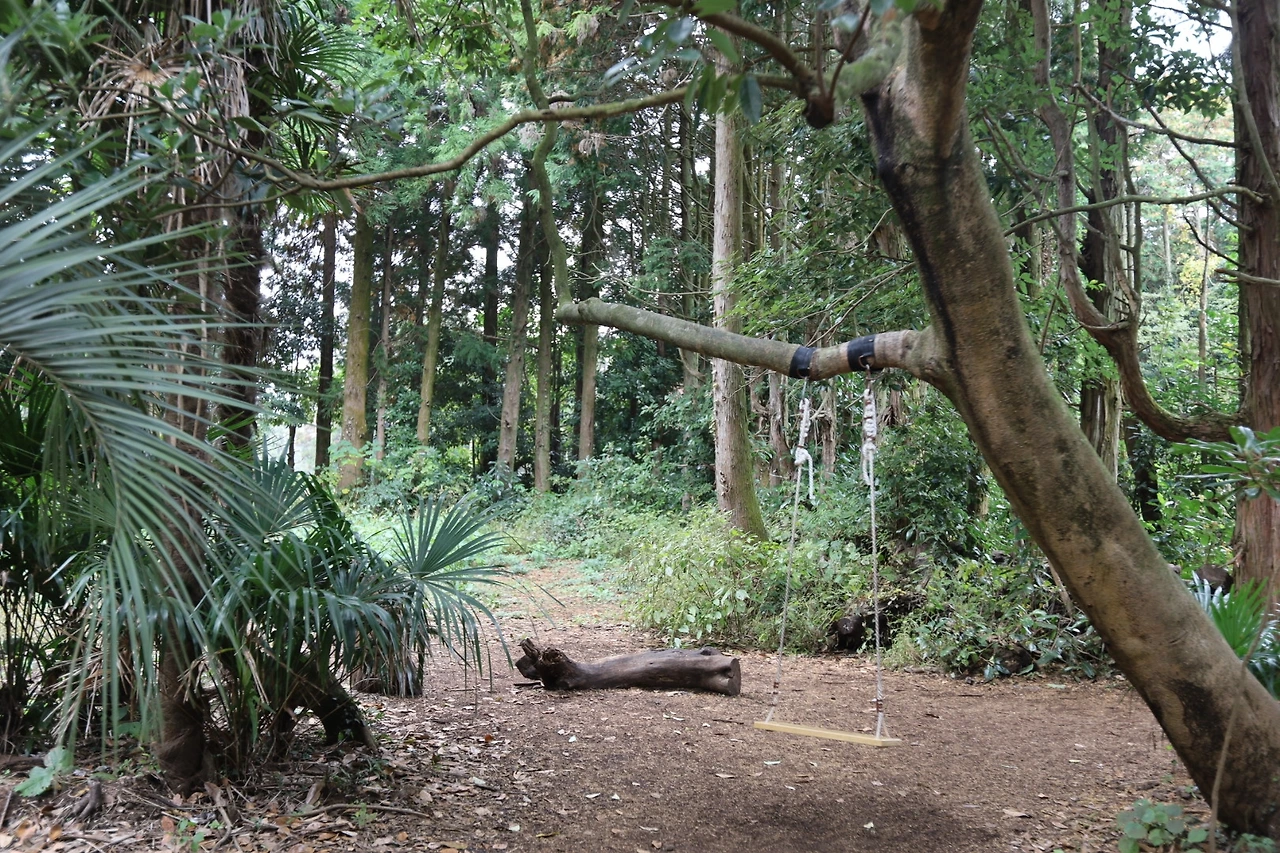 키가 큰 편백나무들이 빽빽하게 자라있는 이 숲은 곳곳에 오두막, 그네,꽃길등
