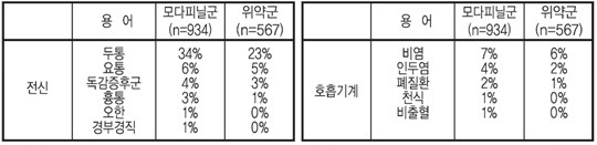 통 1.4%(10명/697명), 오심 1.1%(8명/697명), 불면 1.0%(7명/697명), 식욕부진 0.9%(6명/697