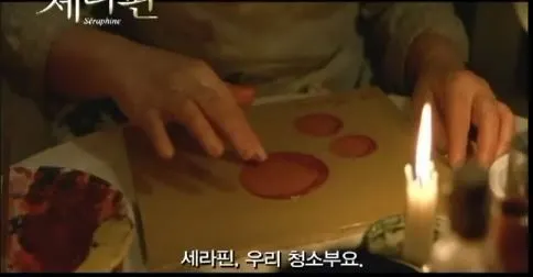 <세라핀>은 맨발로 들판을 걷는 여주인공을 아름답게 포장하지 않는 영화다. 조명과 연출을 최소화해 날것 그대로 그녀가 살던 시대와 가난의 냄새를 보여준다. 화면을 보고 있으면, 며칠을 감지 않아 얼굴에 가닥가닥 눌어붙은 기름진 그녀의 머리냄새가 내 코밑에서 나는 것 같을 정도다. 영화를 시작하는 순간 그 시대로 갈 수 있다. 밤은 정말 어두워서 촛불이 일렁이는 부근 외에 아무것도 화면에서 보이지 않는다. 조명으로 밝히지 않고 어둠을 있는 그대로 보여줌으로써 나도 그 어둠 속에 함께 있는 것처럼 느껴지는 장면이 여럿이다.