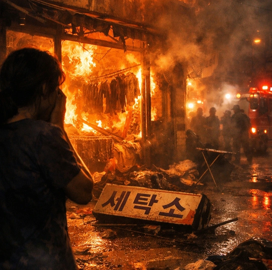 여자가 세탁물을 들고 가게를 나간후 아무도 없는 가게의 전기 선에서 전선 불량으로 스파크가 일고 불이 붙었다고 했다. 마침 여자가 끄지 않고 나간 동작중인 선풍기가 빠른 속도로 불을 확산시켰다고 했다.