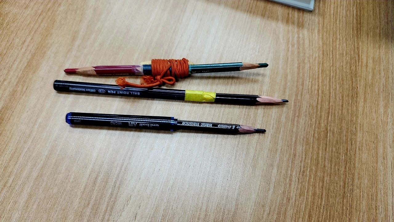 그 밑에는 종이테이프를 둘둘 말아 붙여서 만든 연필.