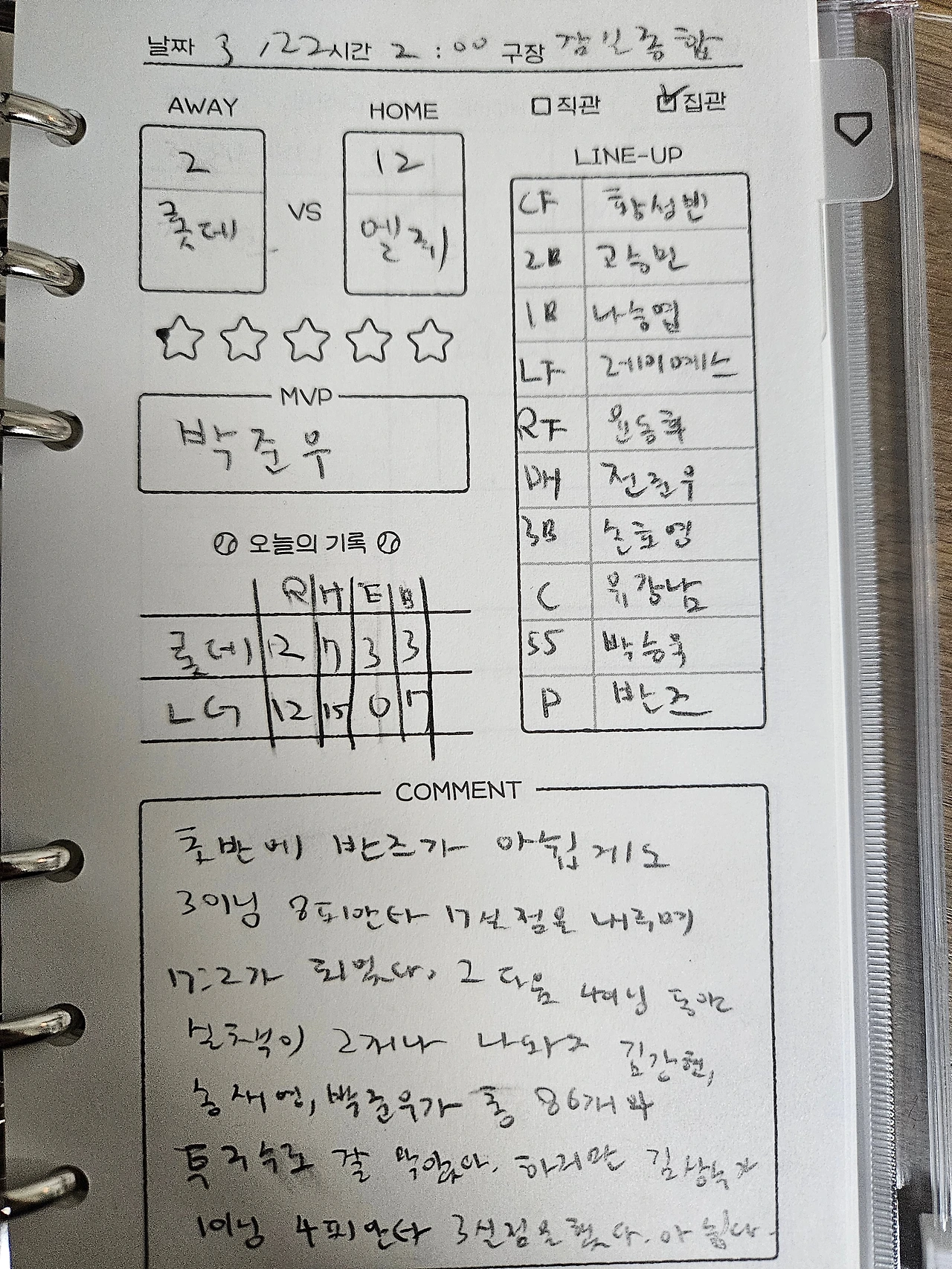매일의 경기 기록을 작성하겠다 했다. 그렇다면 경기가 없는 월요일을 제외하고 매일 경기를 보겠다는 것인가? 적어도 하이라이트는 챙겨보겠다는 것인데, 순간 머릿속이 복잡했다. 초등학교 5학년이 해야 할 일들은 뒤로 미룬 채 과연 좋다는 취미만을 위해 이것을 용납해도 되는 일인가. 스스로 할 일은 하겠다 약속을 받았으니 믿고 하이라이트 시청을 위해 매일 네이버 20분을 허락했다. 그렇게 지금까지 하루도 빠짐없이 야구 다이어리를 작성하고 있다. 그저 어이가 없어 지켜만 볼 뿐이다.