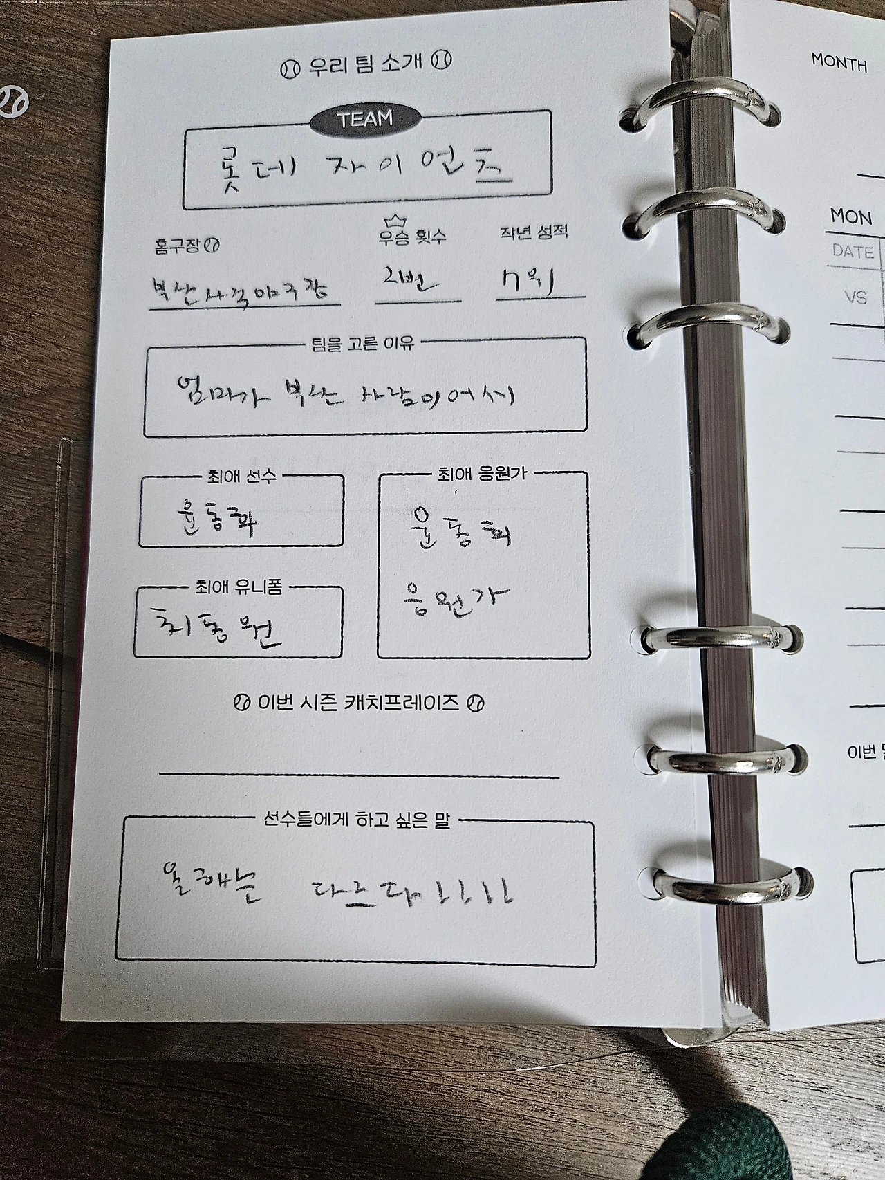 서점 나들이에 간 어느 날, 문구류 코너에서 우연히 발견한 야구 다이어리. 들어는 보셨나? 세상 별게 다 나온다고 지나쳤던 나와 달리, 아이는 그 앞에서 꼼짝마다. 반드시 사야 한단다. 열심히 공부도 하겠다는 조건까지 내세우며, 할 일을 최대한 미루지 않겠다는 약속을 하고 야구 다이어리는 계산대로 직행했다. 그날 저녁, 아이는 2시간을 책상에서 꿈쩍도 하지 않는다. 2시간 내내 야구 다이어리를 꾸미고 있었다. 물론 아기자기하게 꾸미기와는 거리가 먼 다이어리 작성에 중점이 가 있긴 했지만 어찌 됐건 야구 다꾸는 다꾸다.